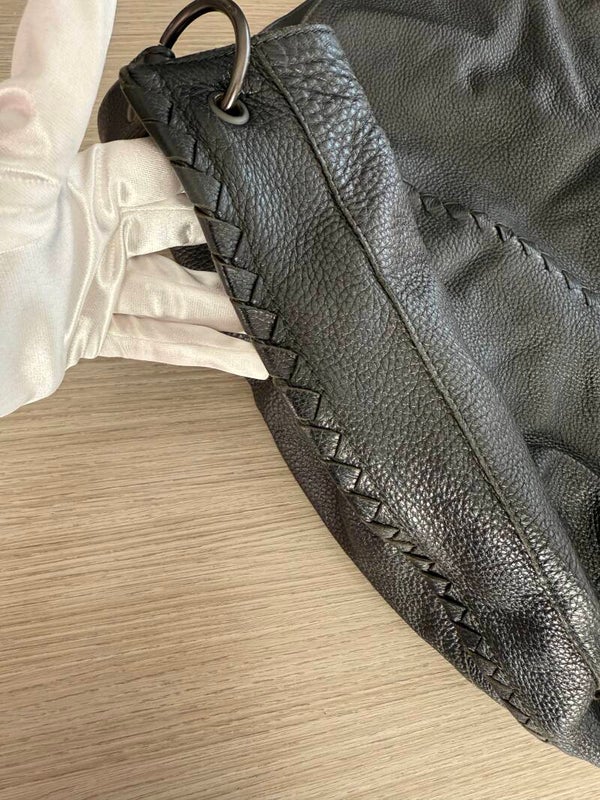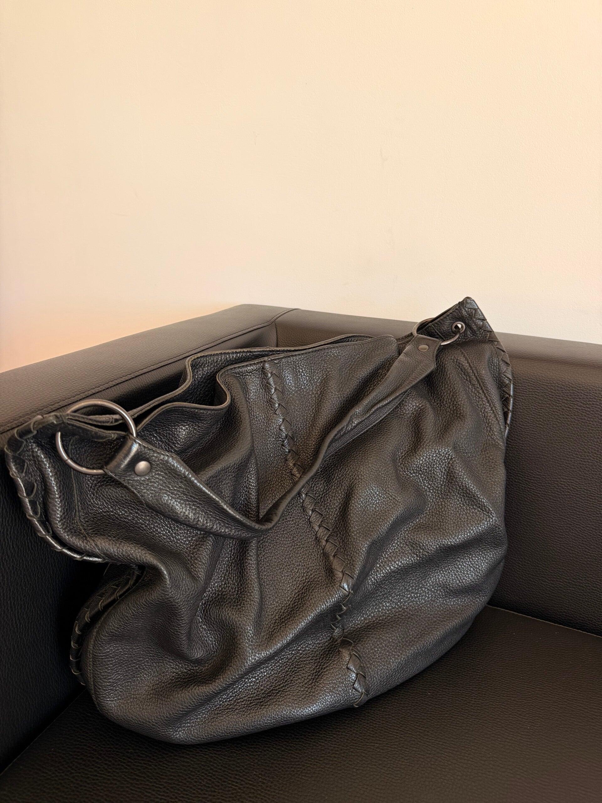 Iconica hobo bag di Bottega Veneta, realizzata in pregiata pelle di cervo nera, nota per la sua morbidezza e grana naturale. Il modello si distingue per le cuciture intrecciate a mano lungo i profili, dettaglio simbolo dell’artigianalità della maison. Capiente e versatile, è la compagna ideale per un uso quotidiano elegante ma disinvolto.