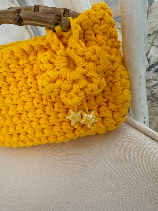 Borsa in crochet giallo con manici in bamboo e Pochette interna .