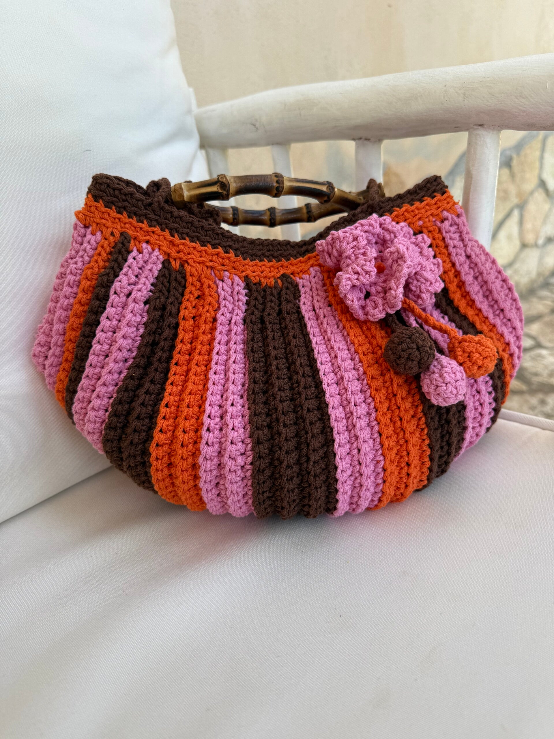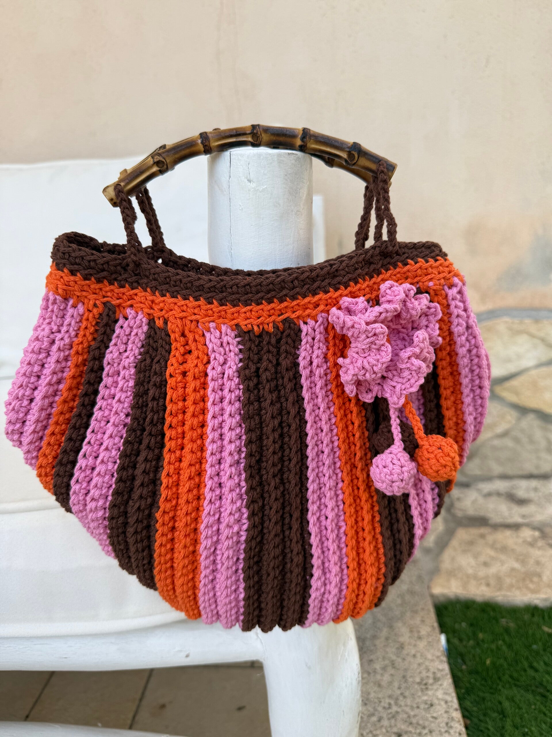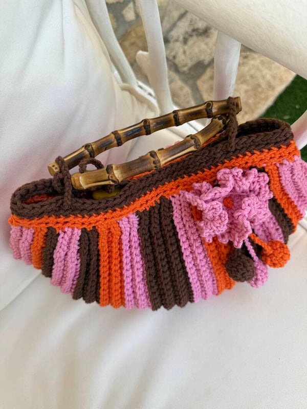 Borsa in crochet tri-color con manici in bamboo e charm in crochet .