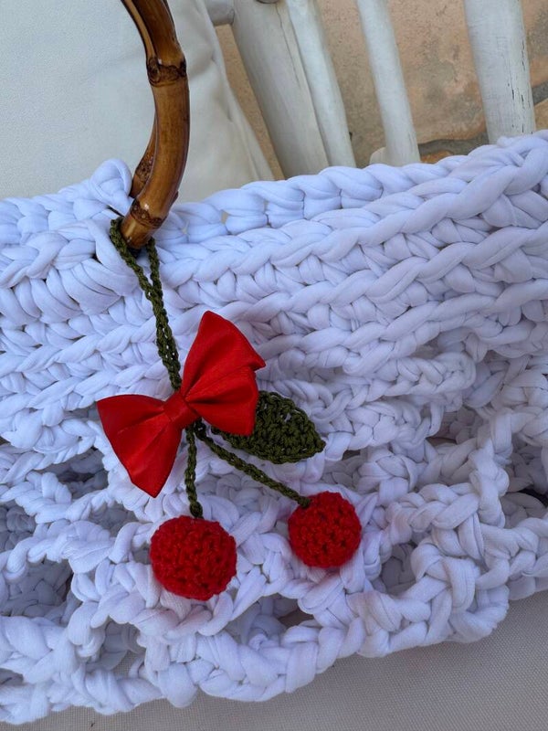 Borsa a uncinetto bianca ,manici in bamboo rotondi e charms ciliegia .