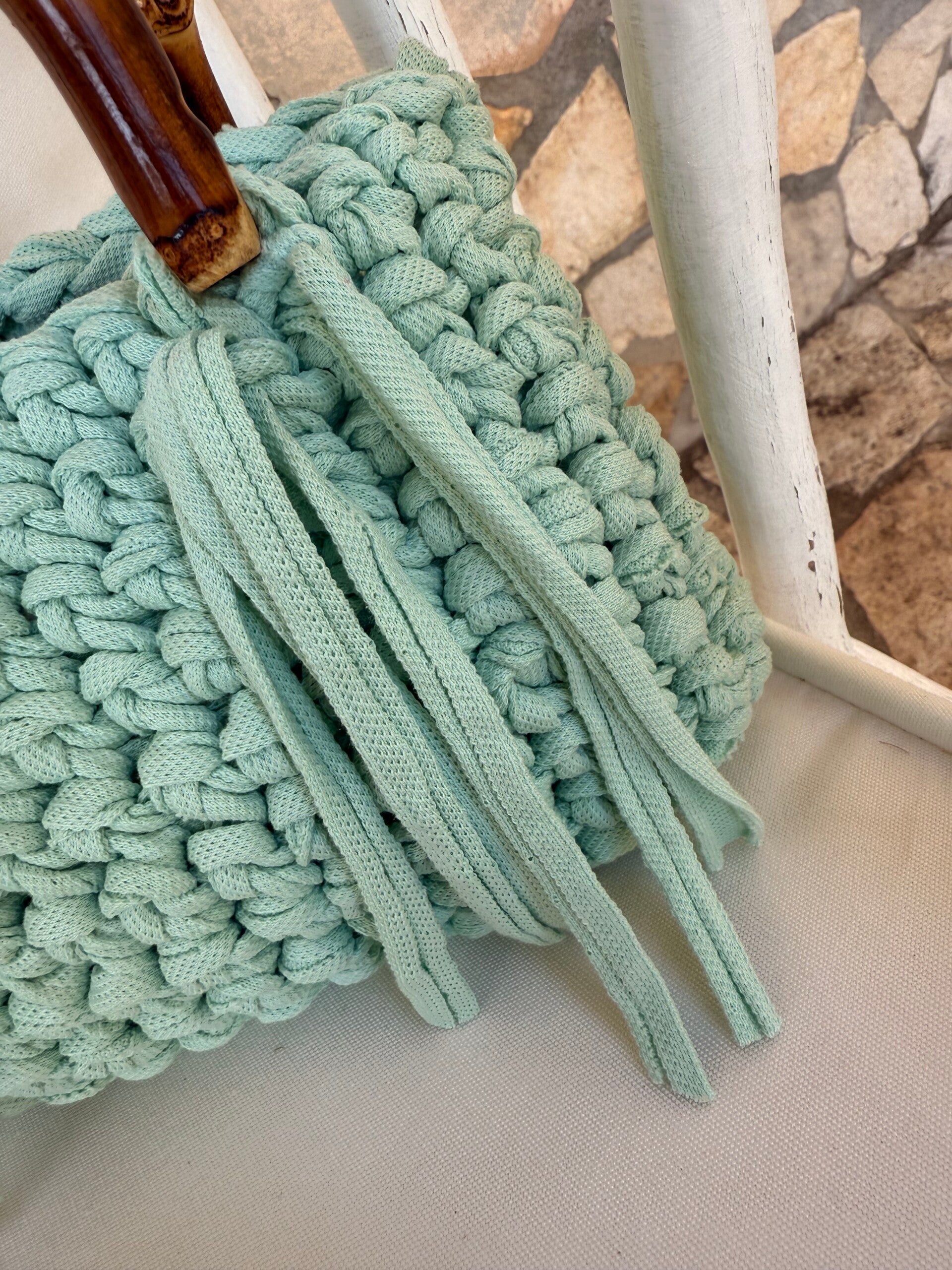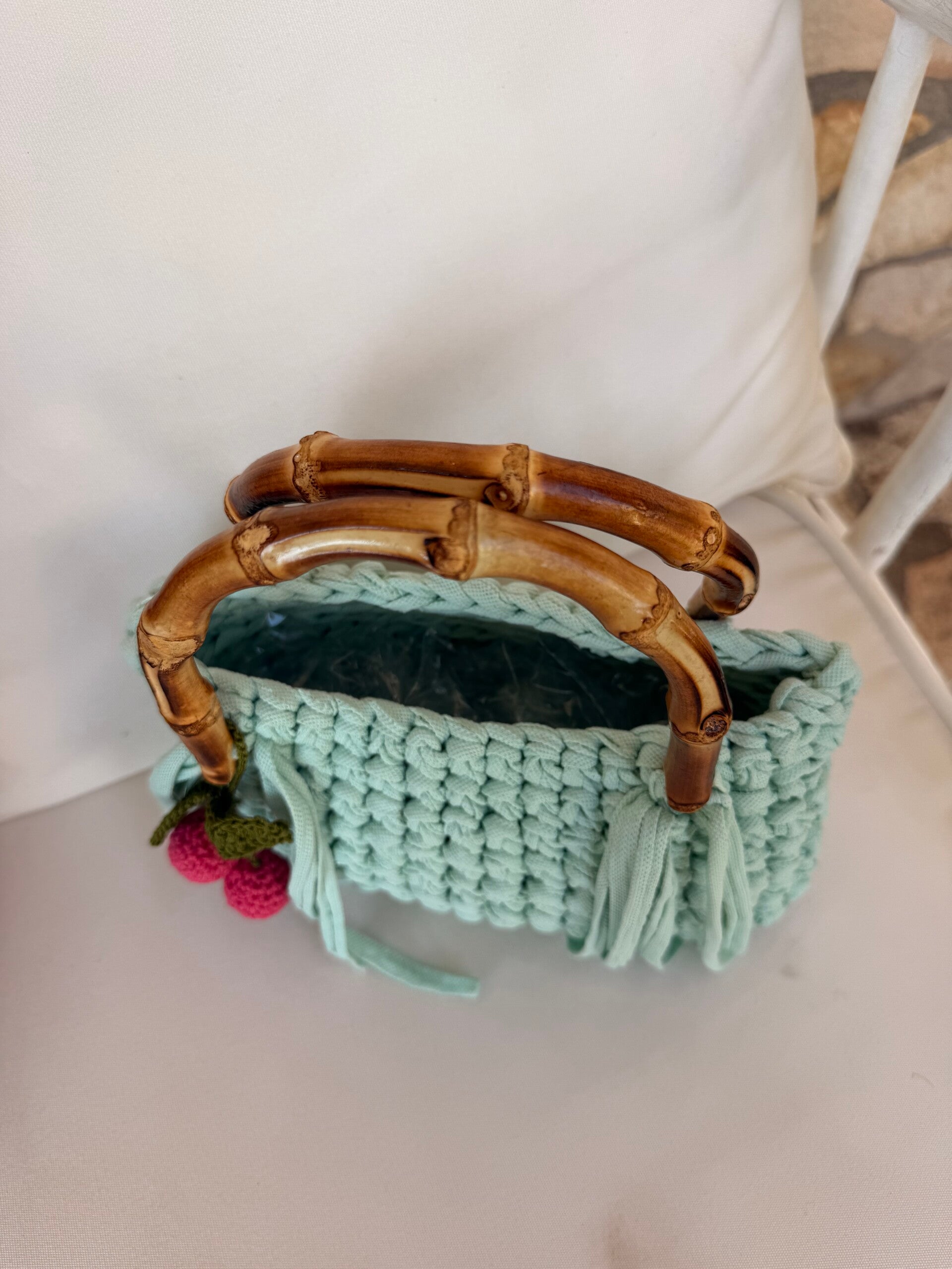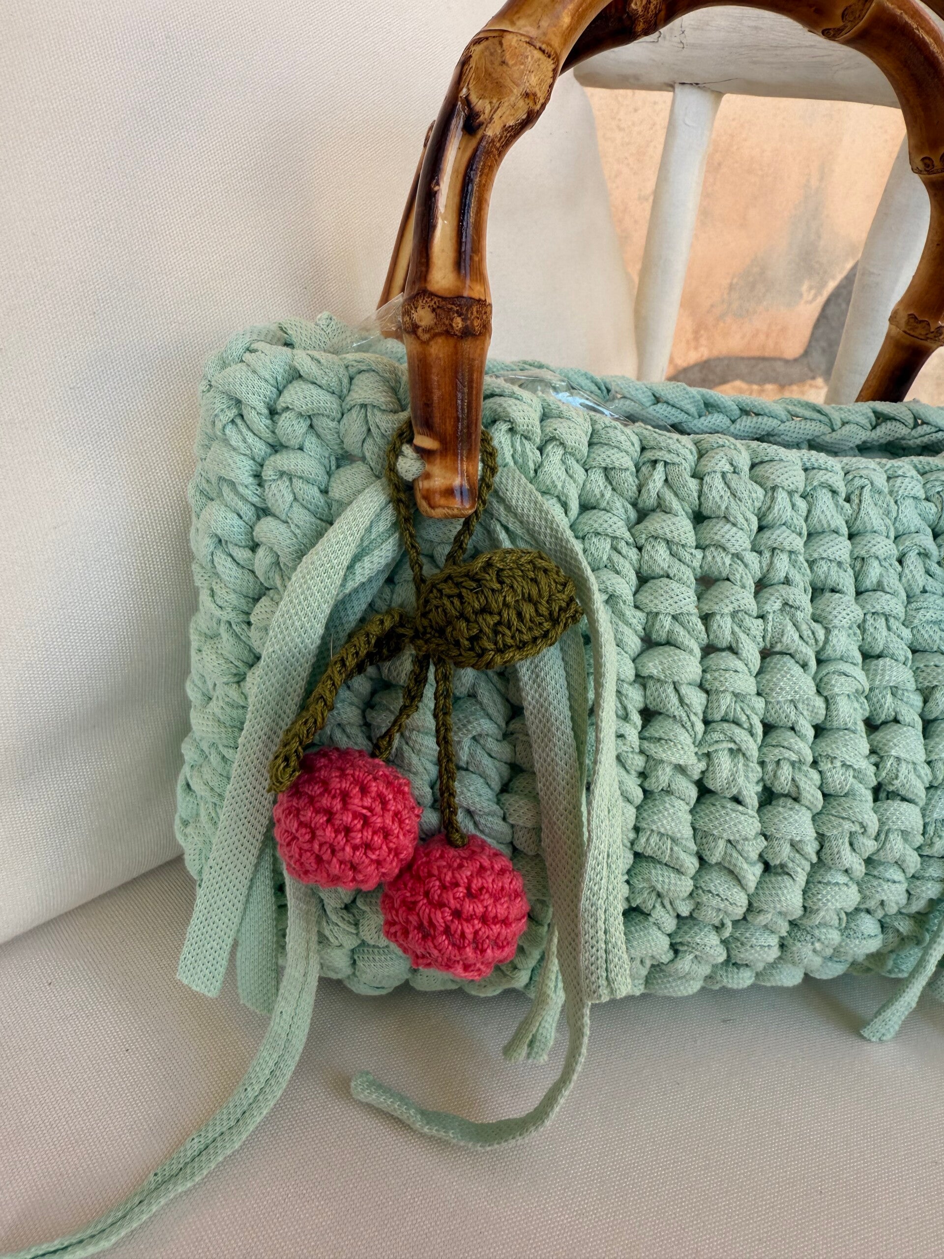 Borsa in crochet con frange e charm in crochet ciliegia .