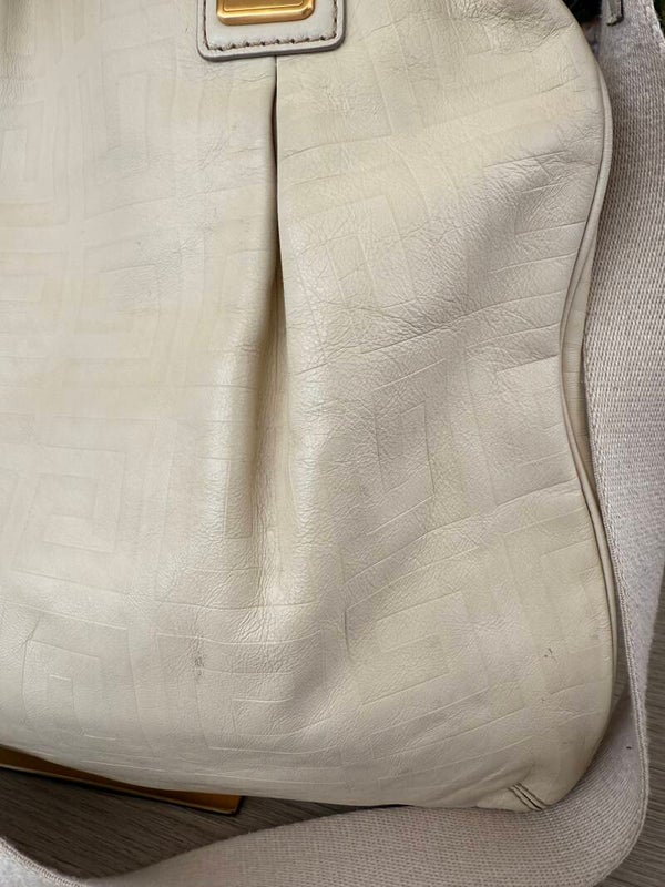 Elegante borsa shopper firmata Givenchy, realizzata in morbida pelle beige con effetto goffrato a motivo geometrico 4G tono su tono. Dotata di doppio manico rigido e tracolla removibile in tessuto, presenta dettagli metallici dorati con placche logate che donano carattere e riconoscibilità. Interno spazioso, ideale per l’uso quotidiano o da viaggio.