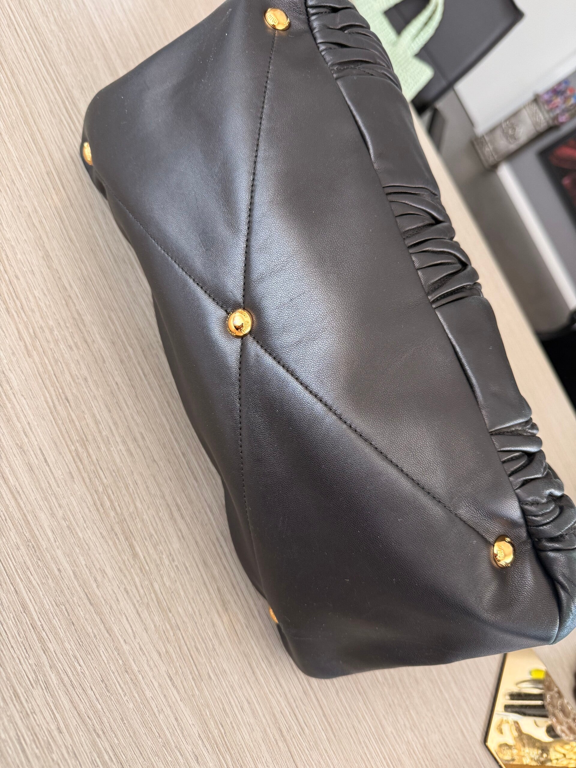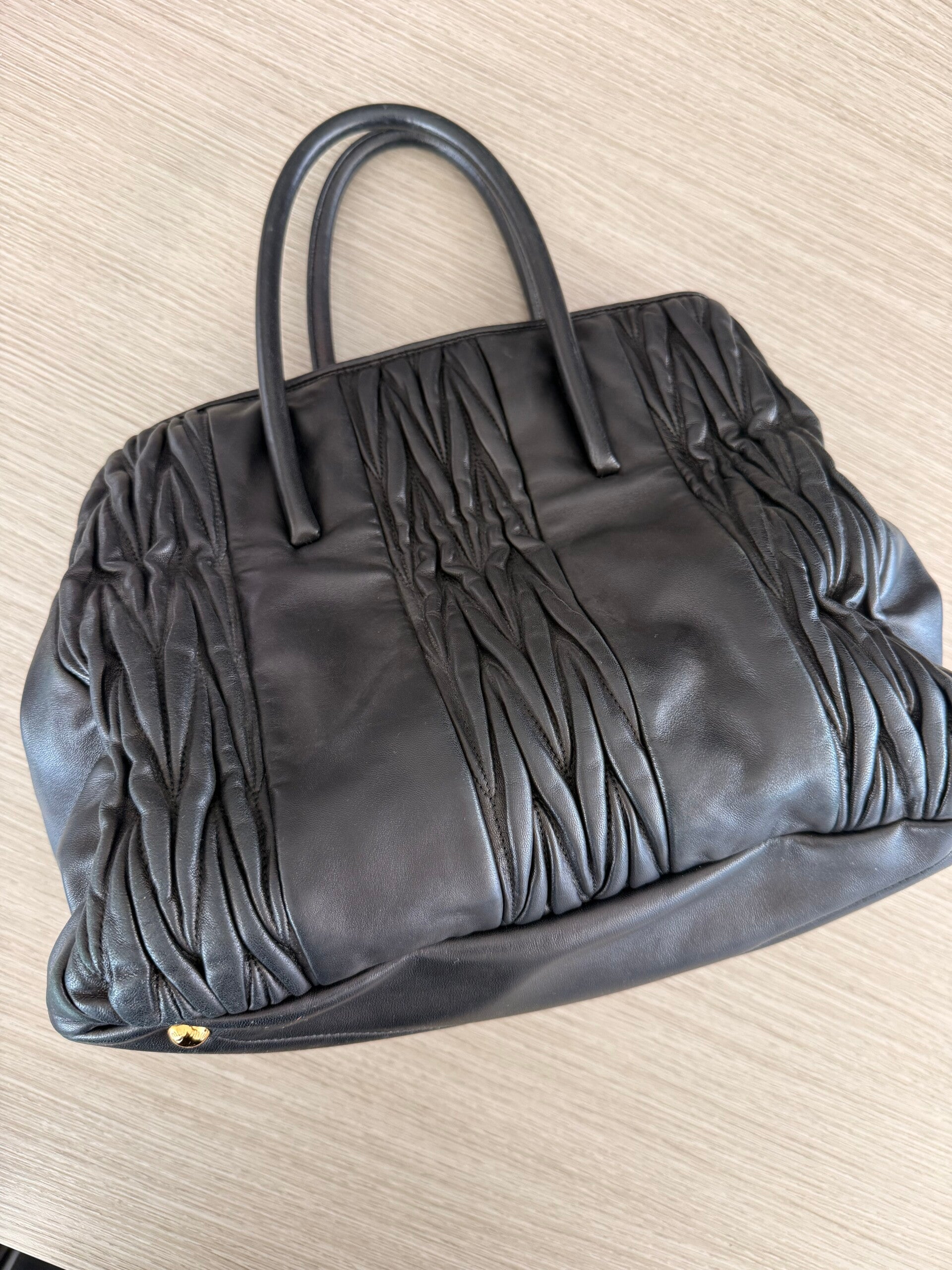 Borsa Miu Miu realizzata in pregiata pelle nera con lavorazione matelassé verticale, dettaglio iconico della Maison. Il modello è strutturato ma morbido al tatto, con doppi manici rigidi e logo Miu Miu in metallo dorato applicato sul fronte. Capiente e sofisticata, è ideale sia per l’uso quotidiano che per completare look eleganti.