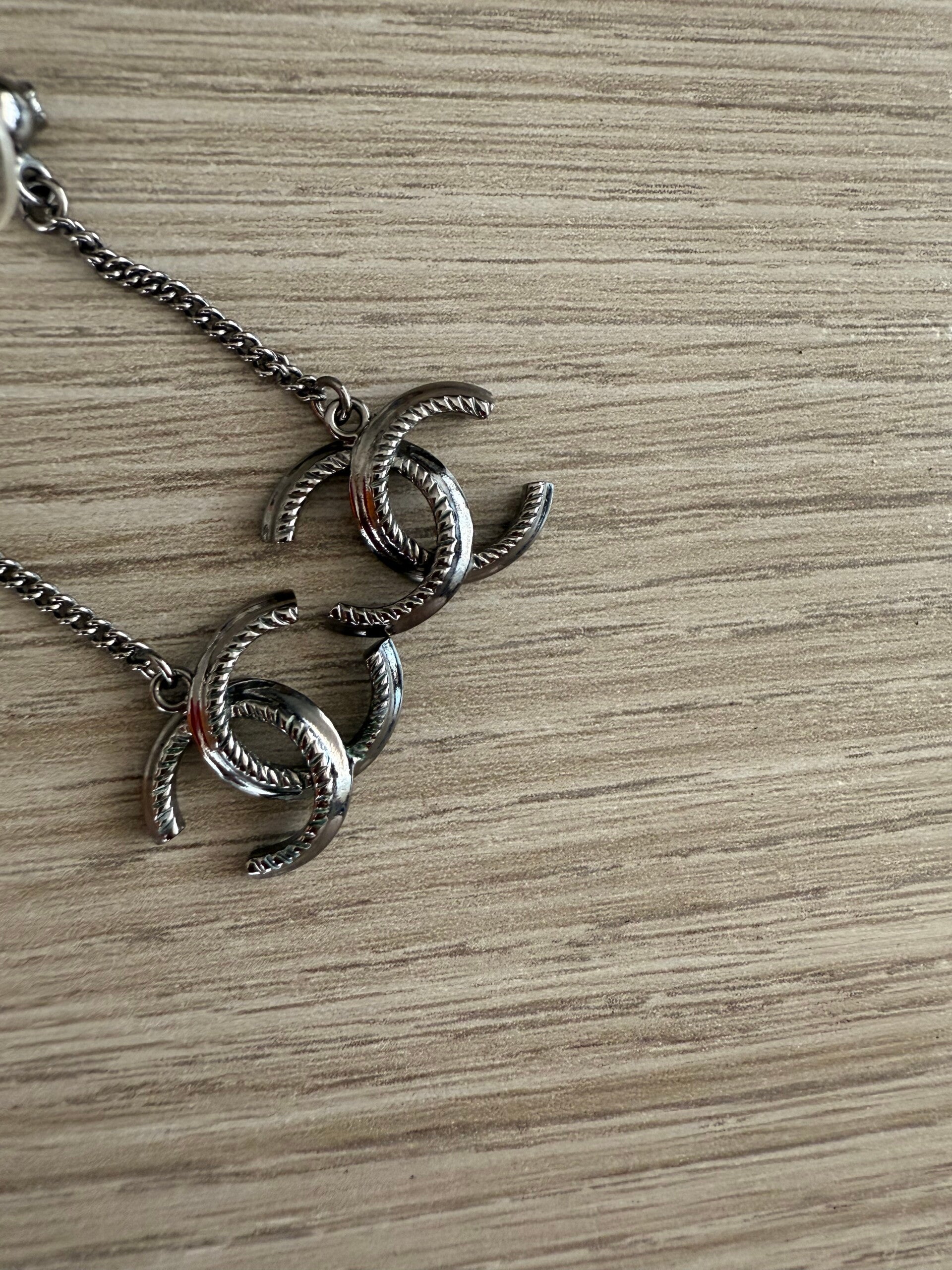 Eleganti e iconici, questi orecchini pendenti firmati Chanel presentano il celebre logo CC intrecciato, sospeso a una sottile catenella in metallo argentato. Il dettaglio inciso a rilievo sui loghi dona texture e carattere, mentre la chiusura a perno con clip trasparente garantisce stabilità e comfort.