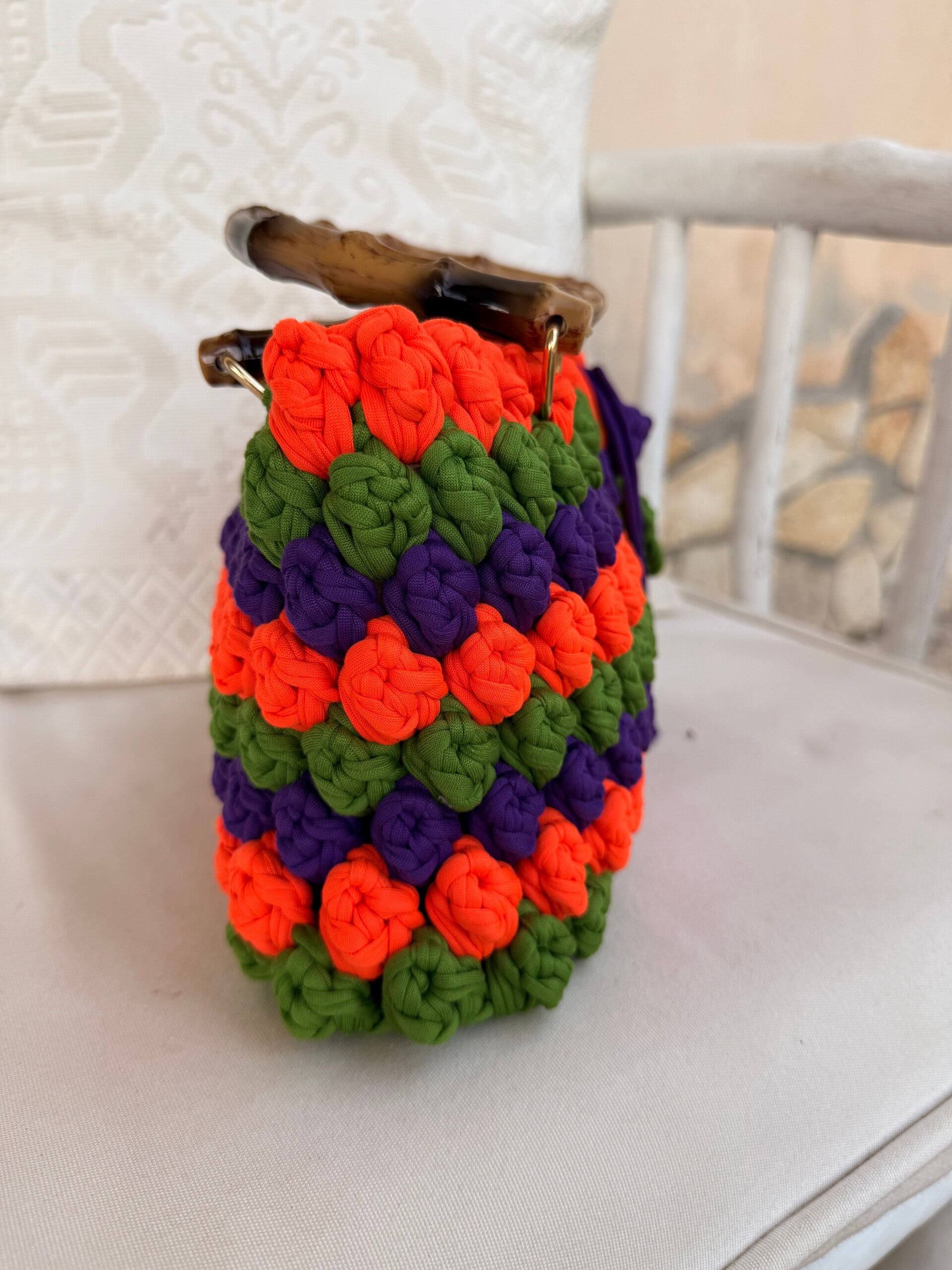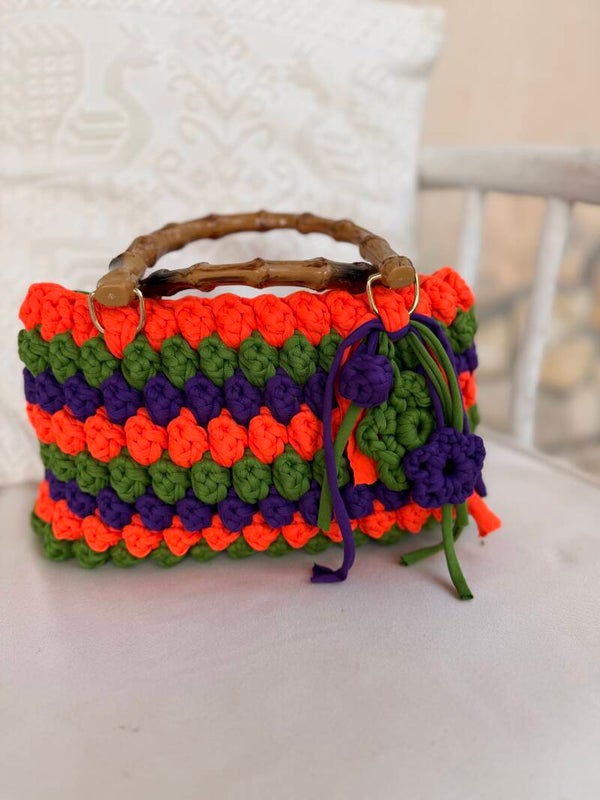 Borsa in crochet con manici in bamboo a tre colori con charm in crochet .
