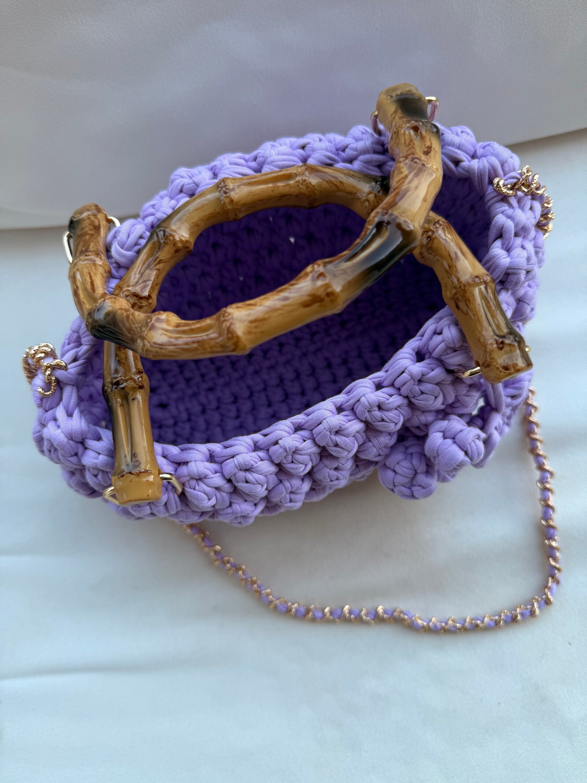 Borsa realizzata in crochet con manici in bamboo , catena gold e charm .