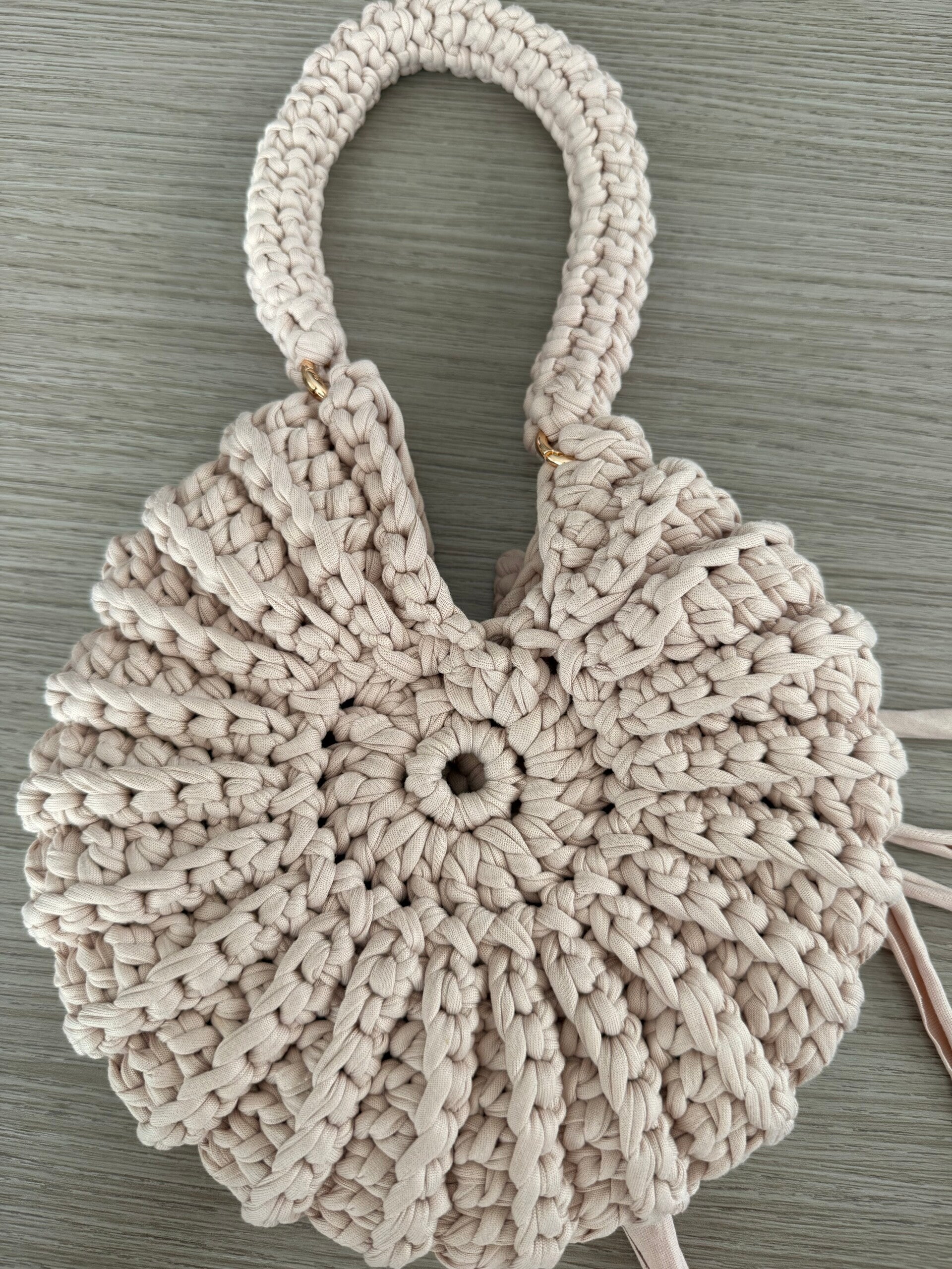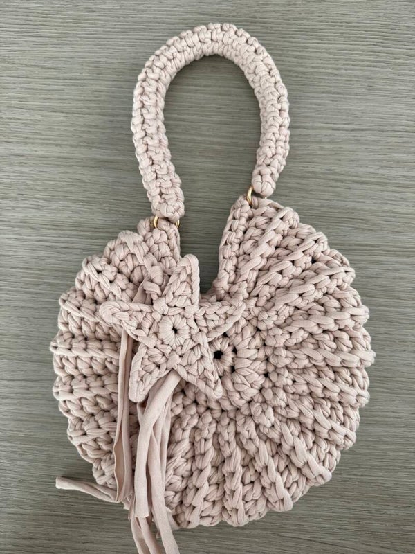 Borsa in crochet , beige rosato con manico corda e charm stella .