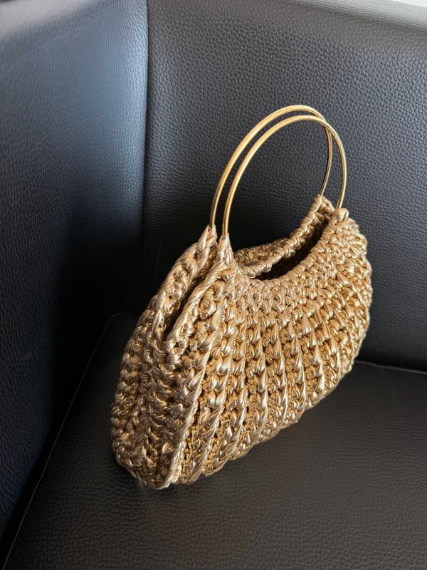 Realizzata interamente a mano con cordino dorato e manici rigidi metallici, la “Golden Ring” unisce artigianalità e charme contemporaneo.