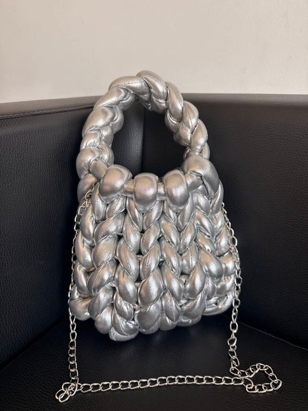Un intreccio morbido e prezioso, realizzato interamente a mano con filato argentato effetto satin.