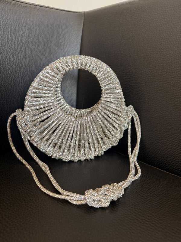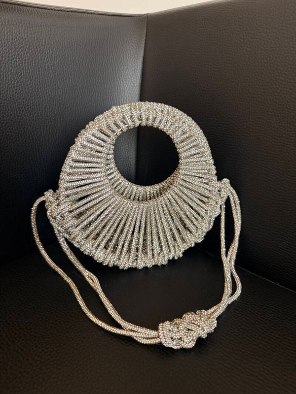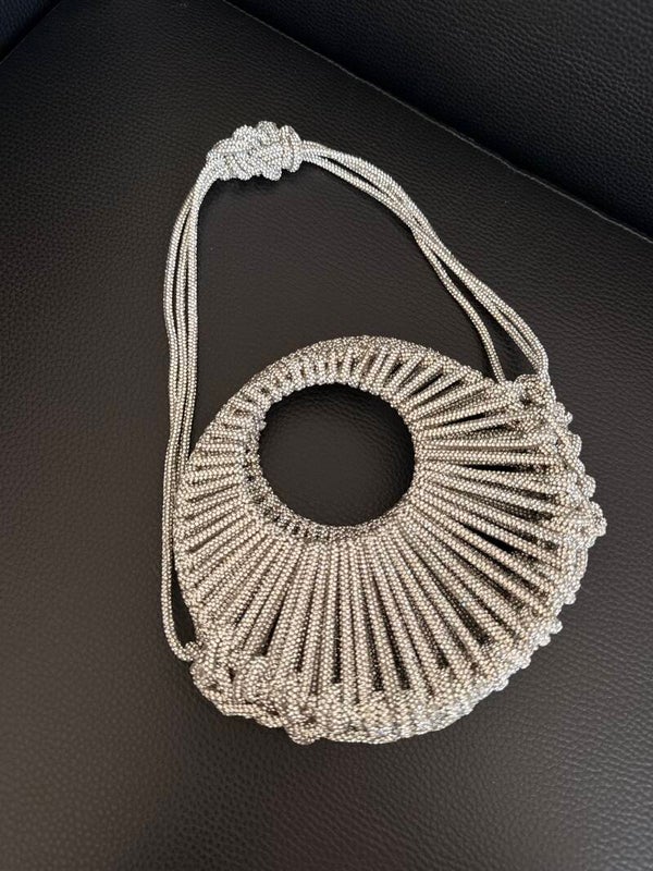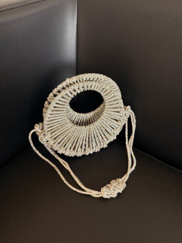 Interamente intrecciata a mano con cordino luminoso color champagne, la “Diamond Halo” conquista per la sua forma circolare e il design scultoreo che richiama una corona di luce.