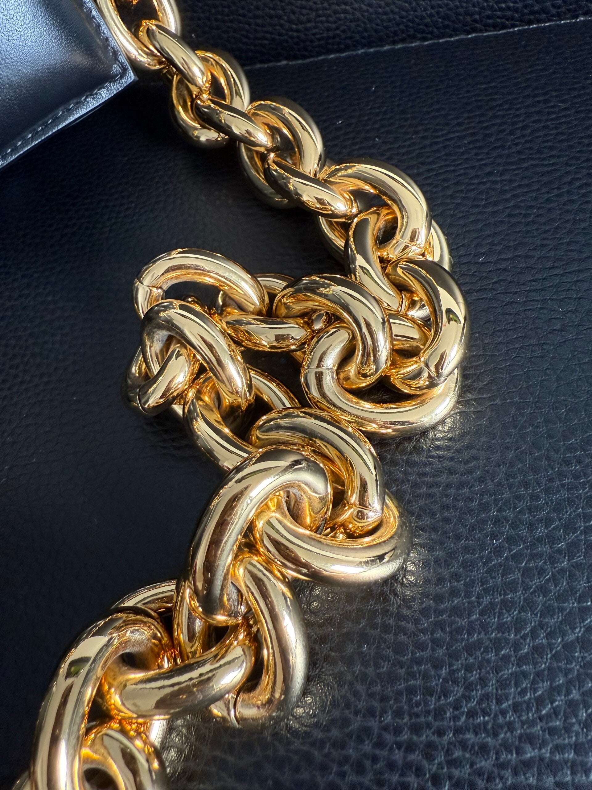 Dotata di catena dorata oversize in metallo lucido, utilizzabile sia come manico a spalla che come tracolla.