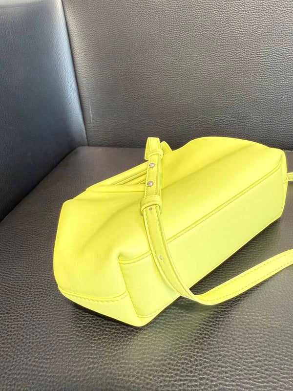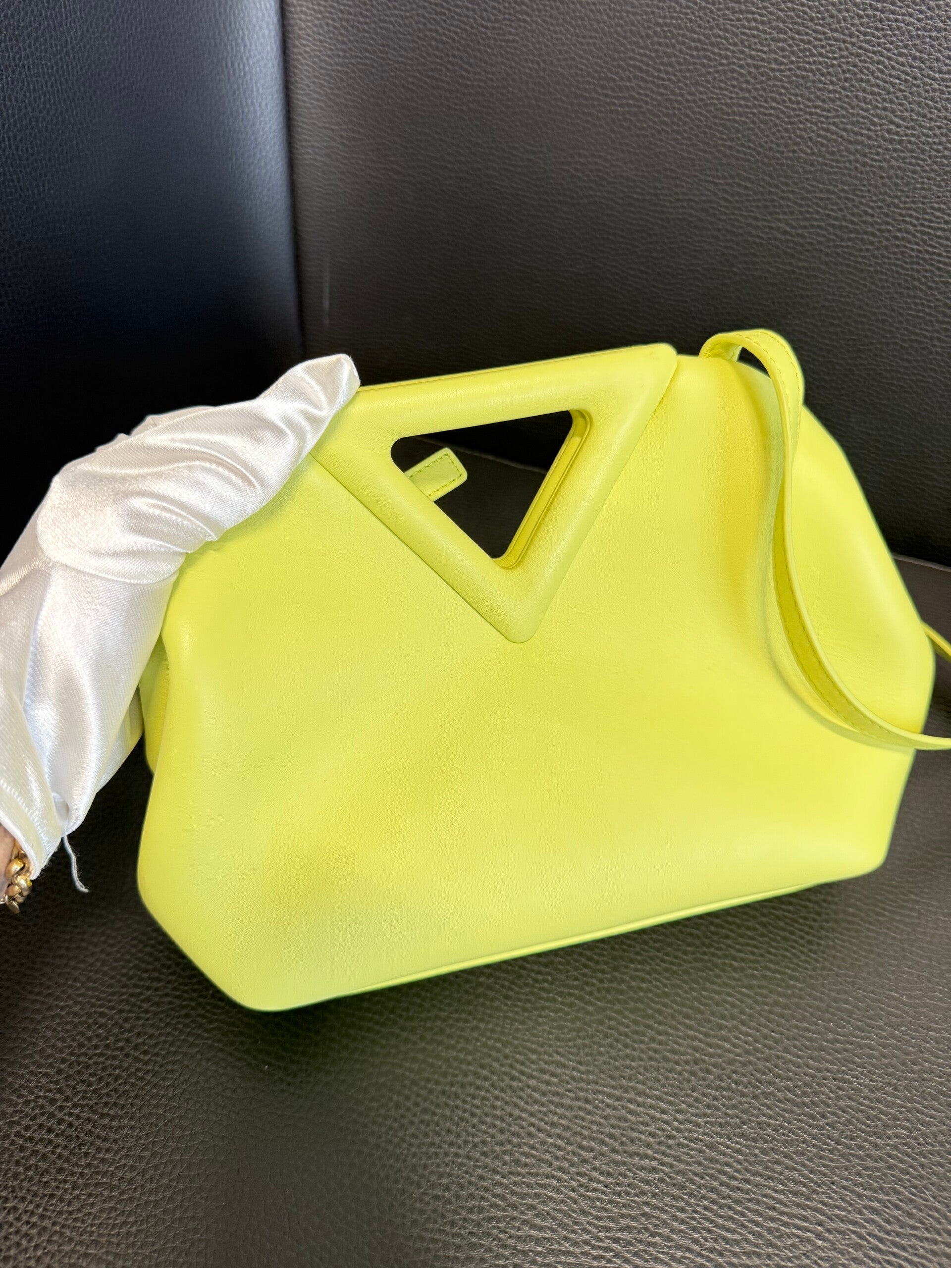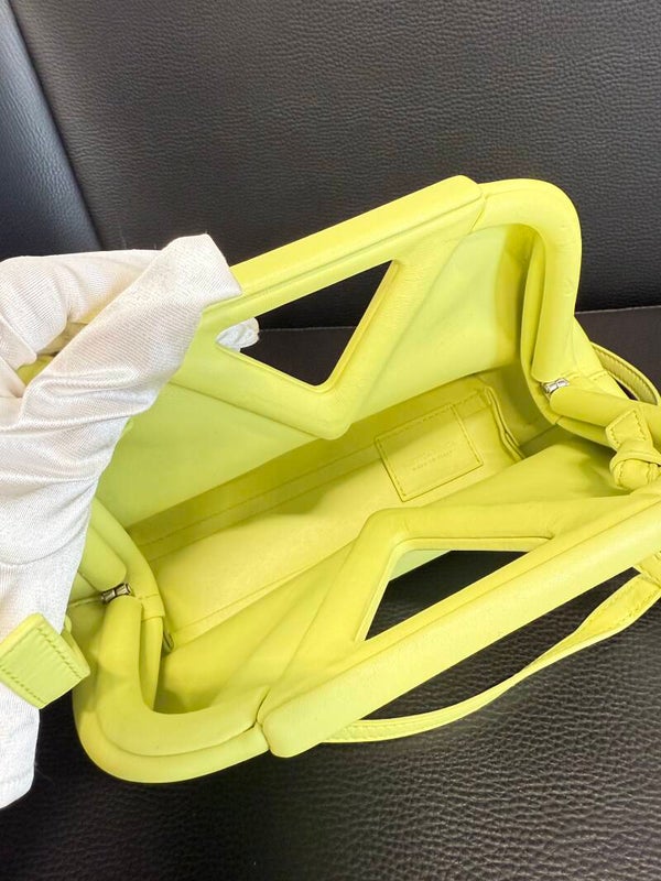 Realizzata in morbida pelle di vitello nella vibrante tonalità lime, si distingue per il manico rigido triangolare che definisce il suo design scultoreo e moderno.
