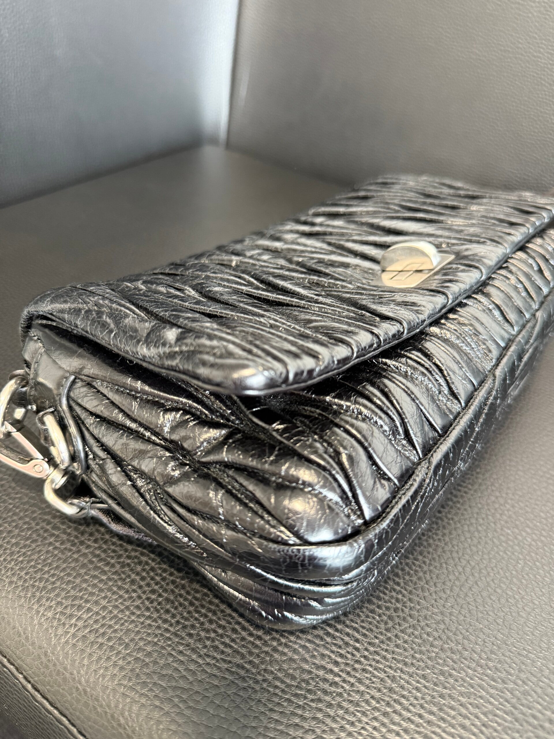 Iconica borsa Miu Miu matelassé nera in pelle, un modello intramontabile del lusso contemporaneo.