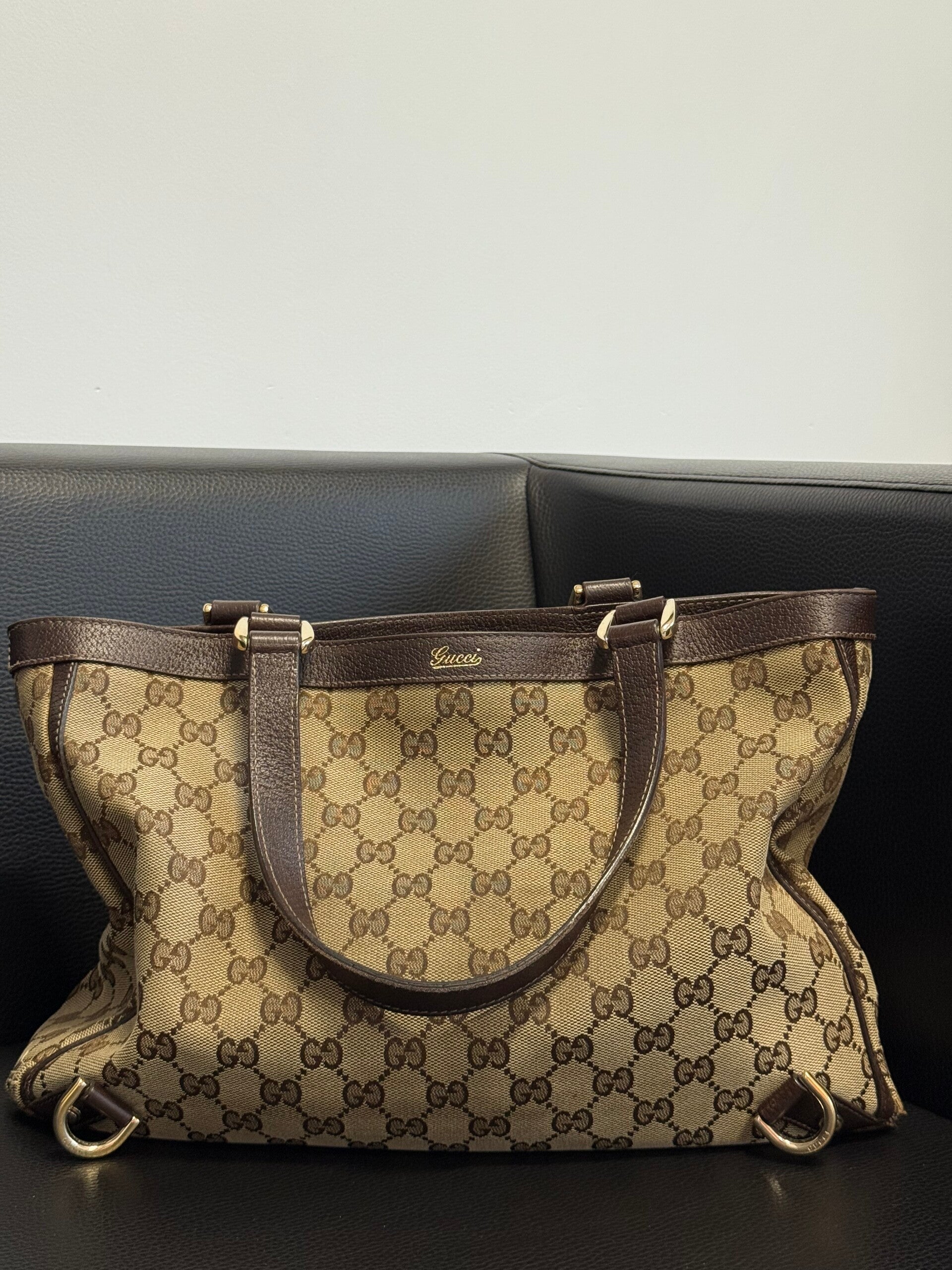 La classica tela beige con motivo GG all-over, abbinata ai profili e ai manici in pelle marrone, la rende una borsa resistente, funzionale e intramontabile, perfetta da portare a spalla dal giorno al lavoro.