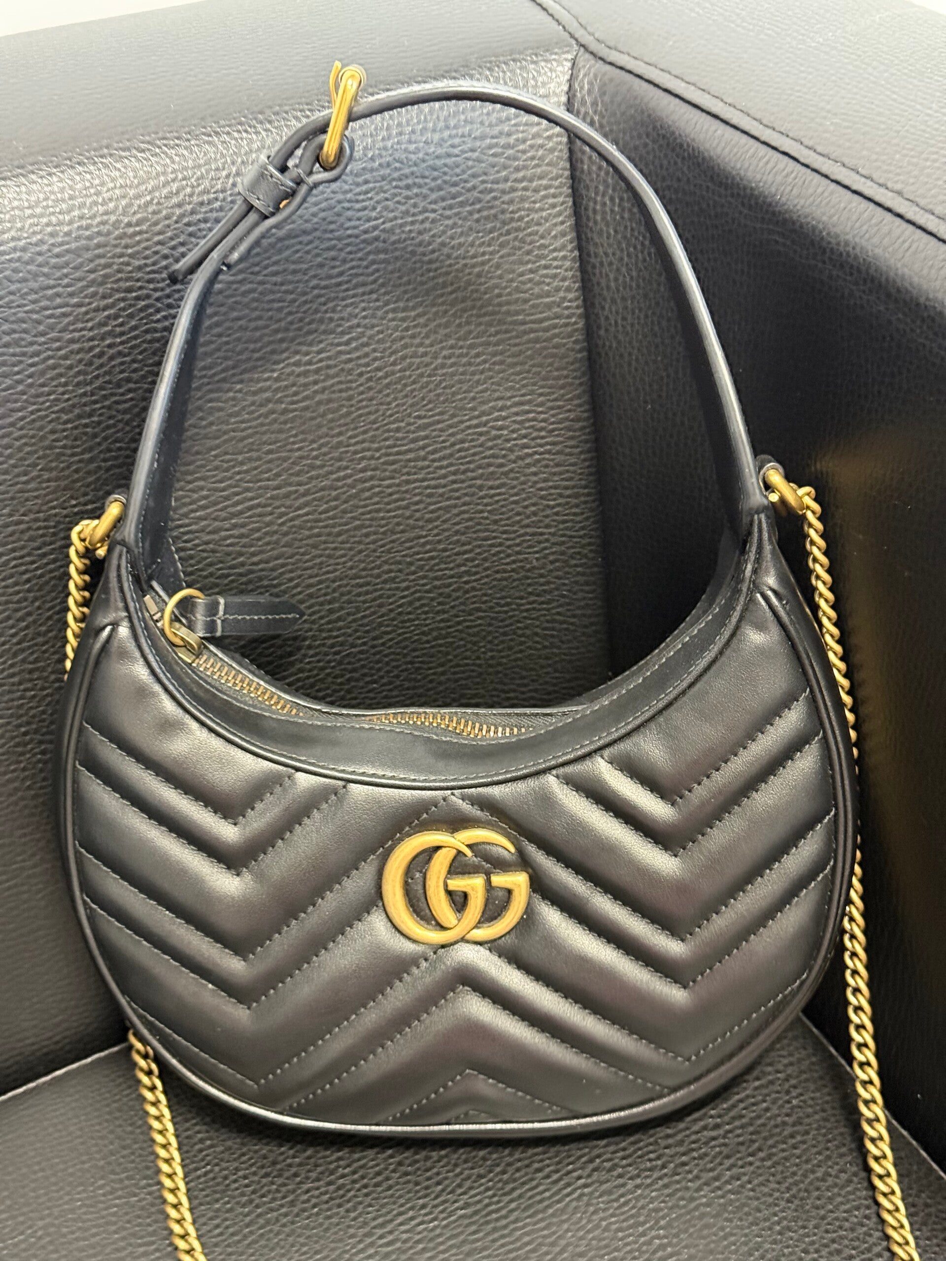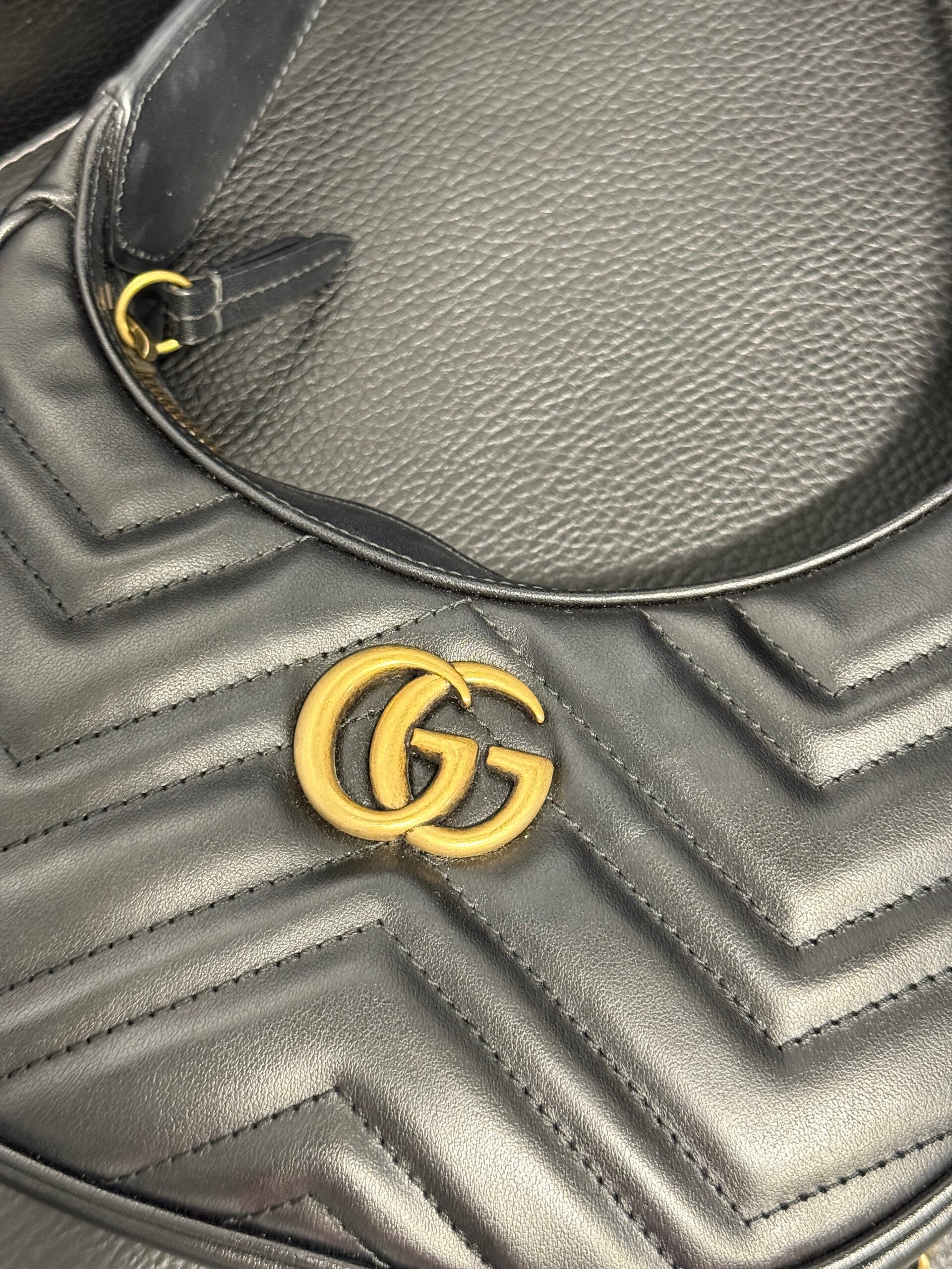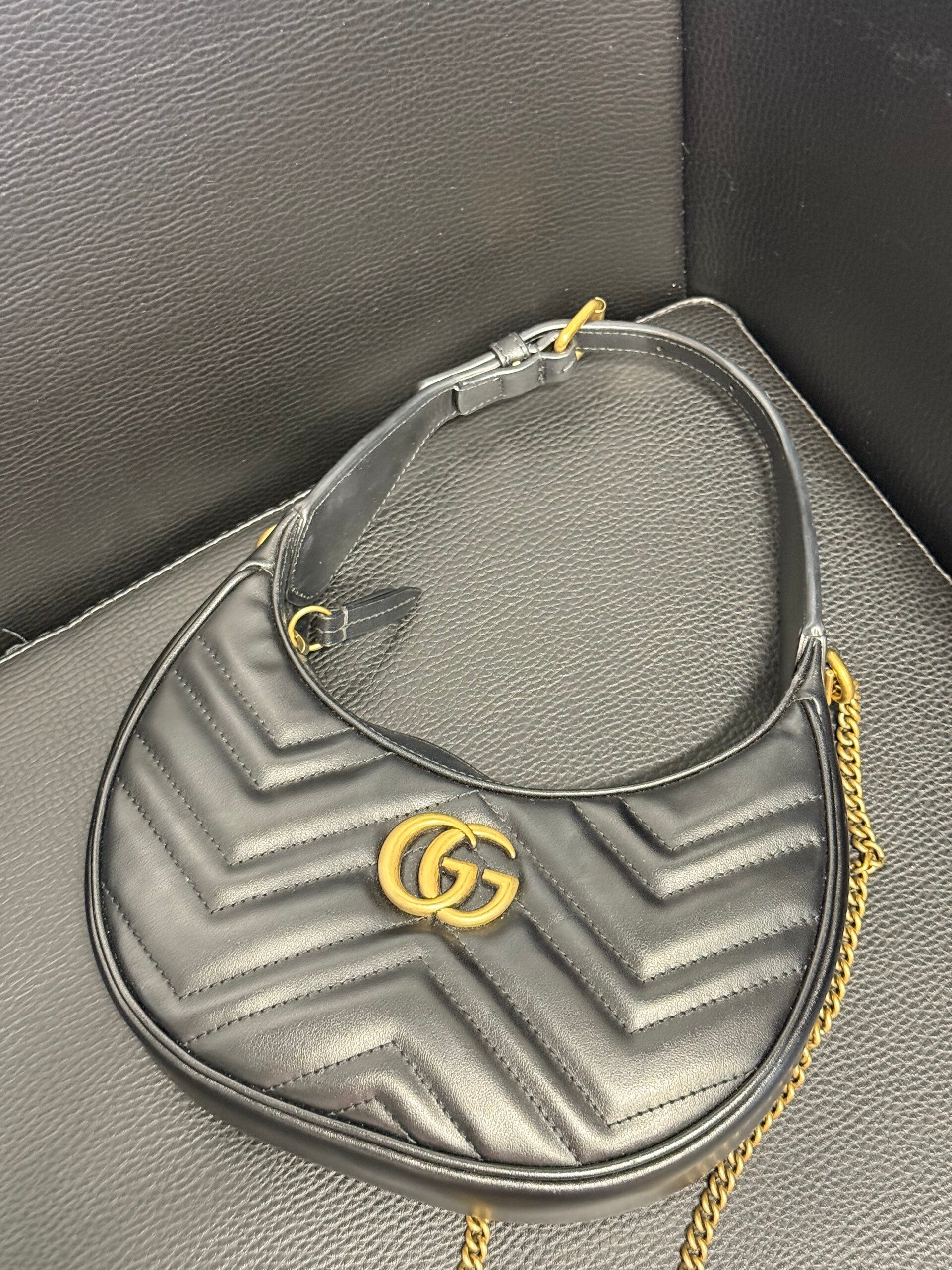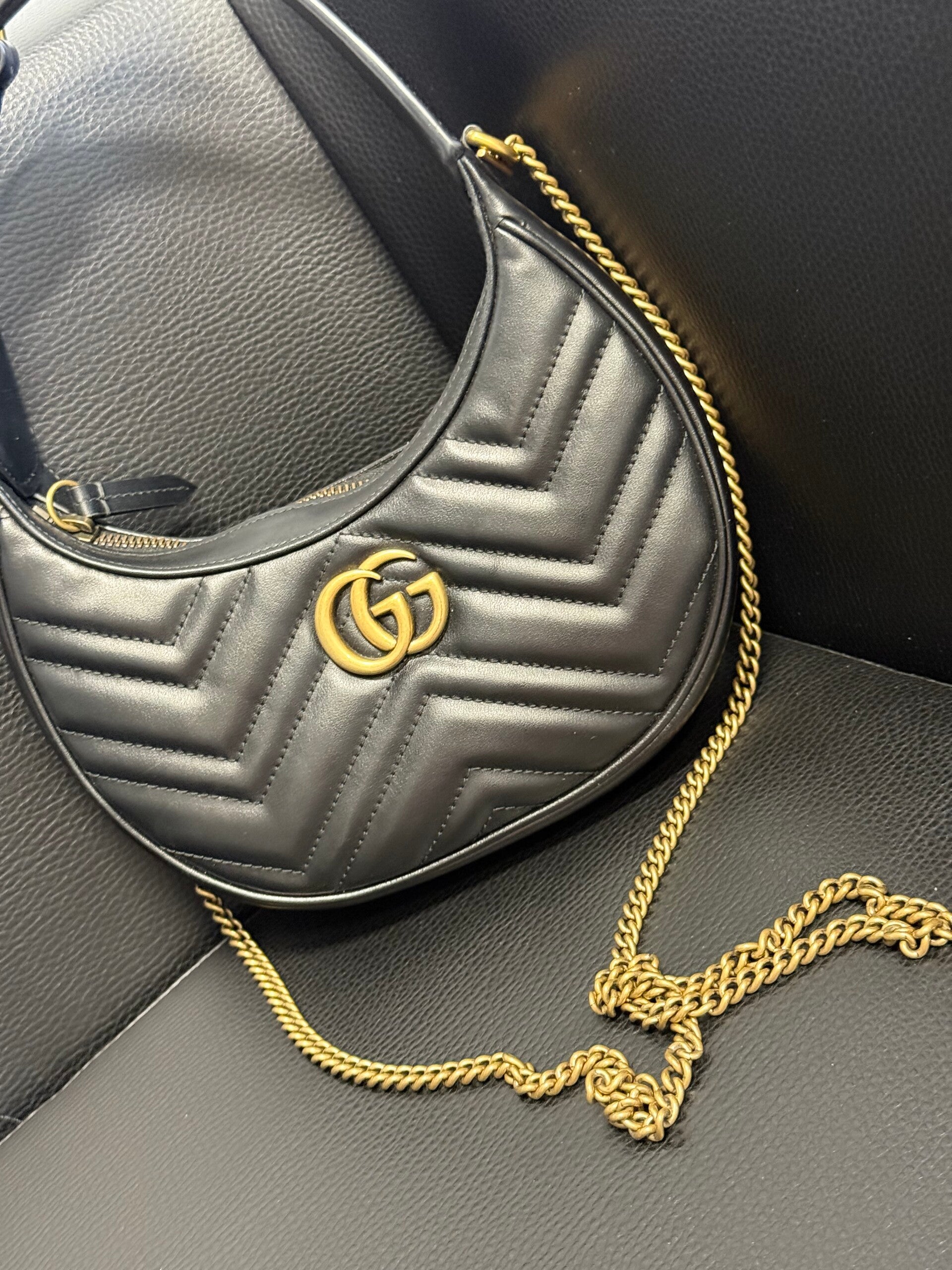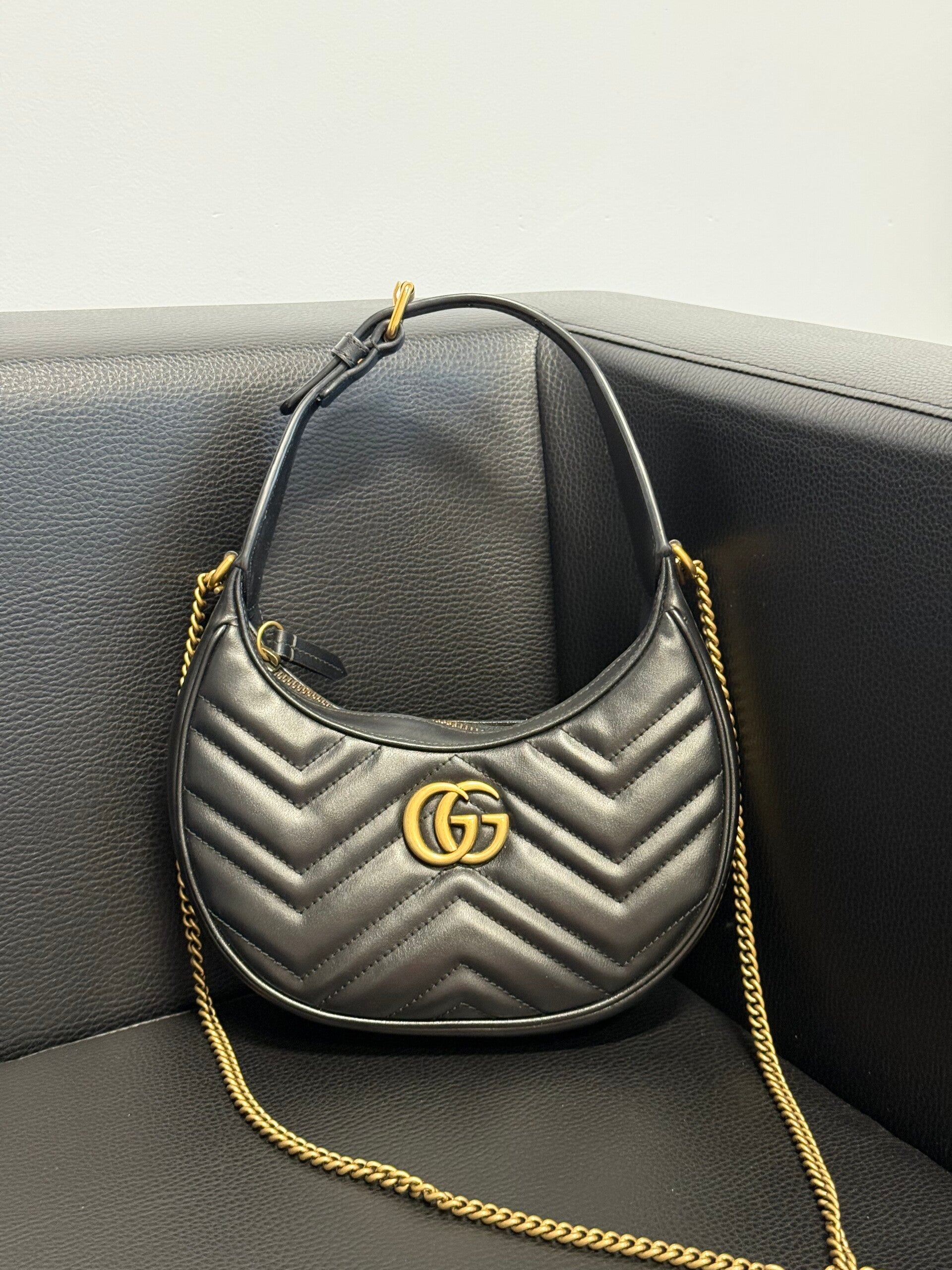 Compatta, grintosa e super desiderata: mini shoulder bag firmata Gucci linea GG Marmont, con iconica trapuntatura chevron e logo GG frontale dorato.