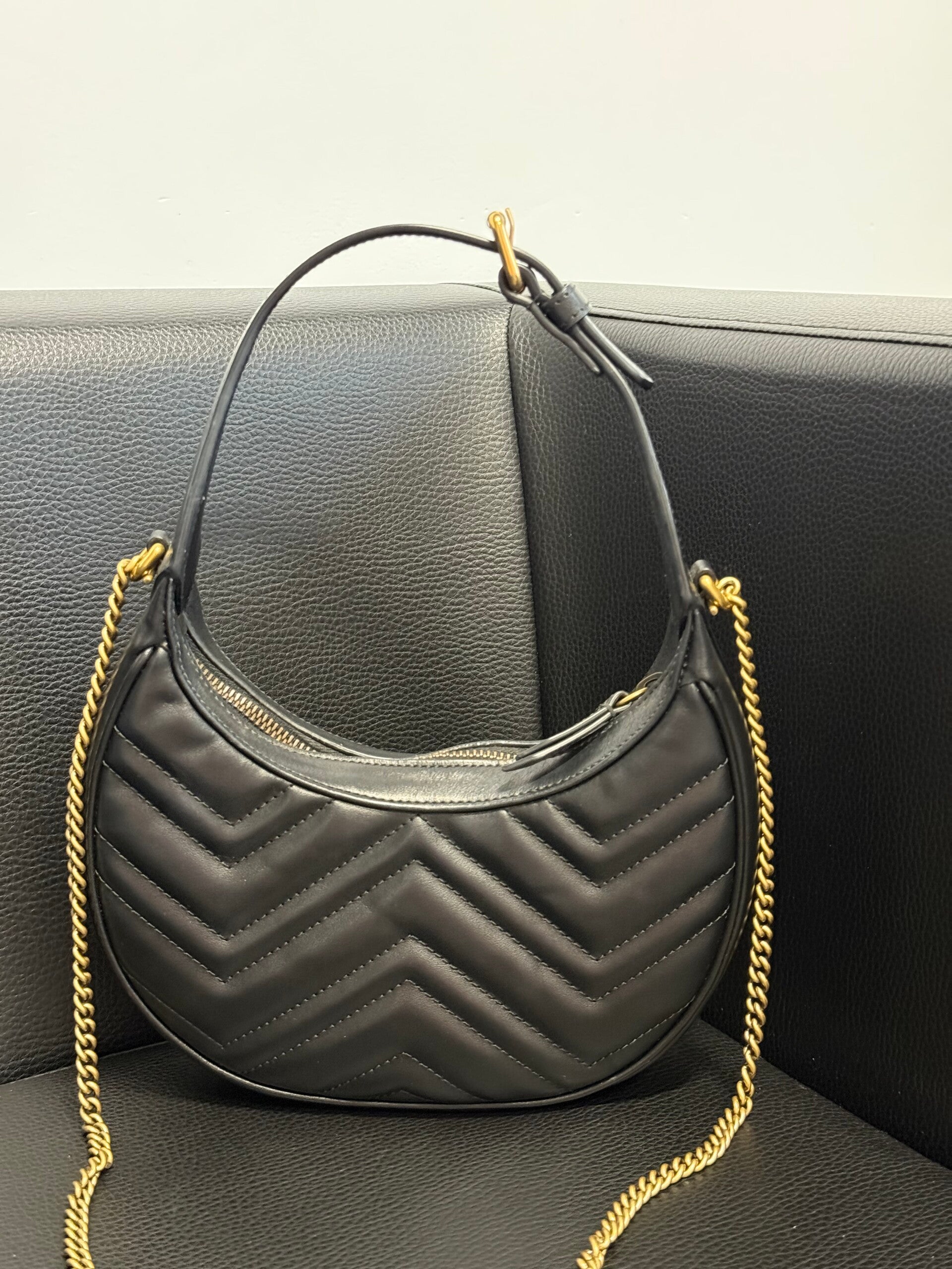 La forma morbida a mezzaluna la rende perfetta sotto braccio, mentre la tracolla a catena permette anche la portabilità crossbody. Una caramellina fashion facile da indossare, perfetta dal giorno alla sera .