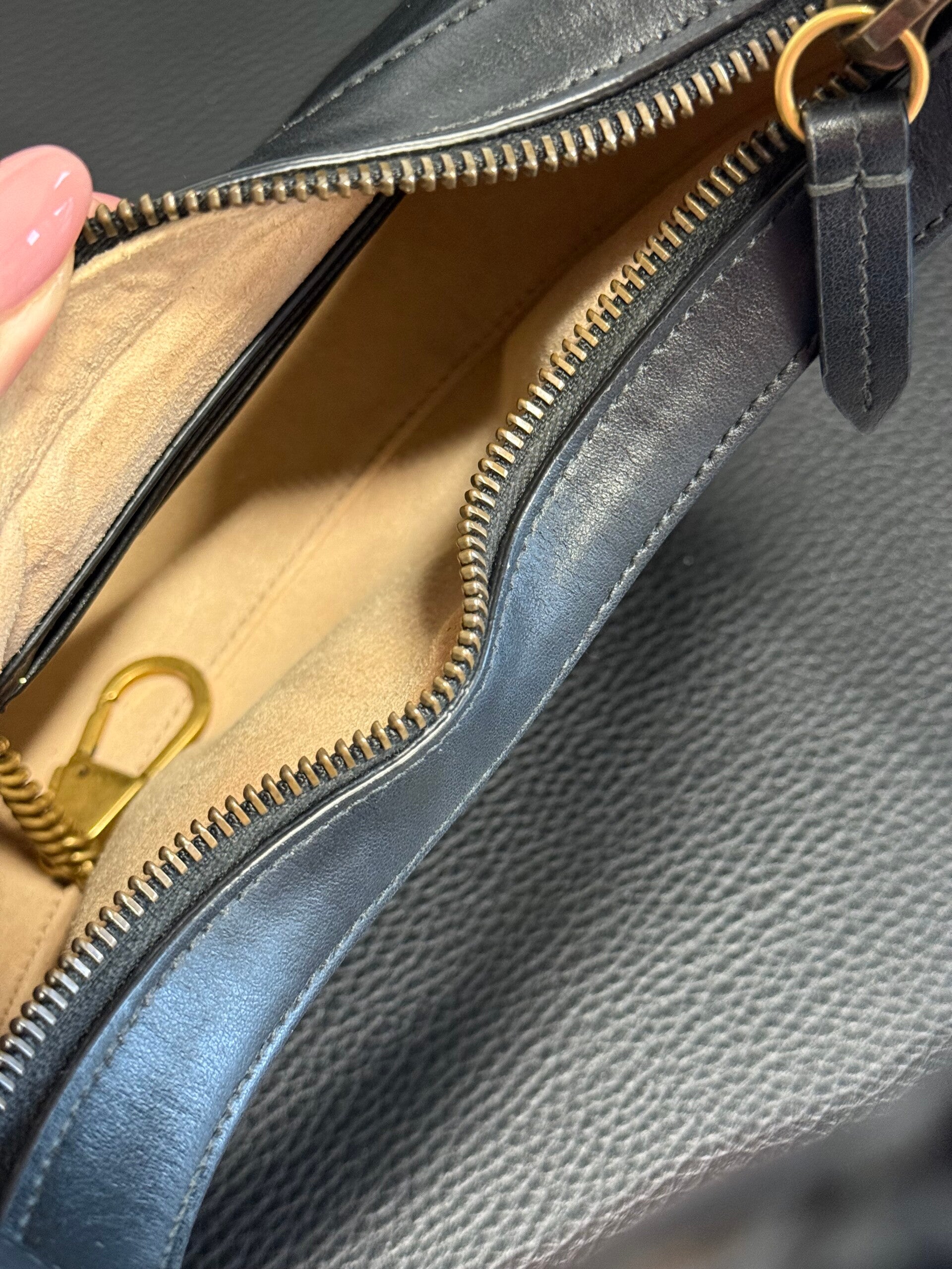 Ottime condizioni generali pre-loved. Lievi segni compatibili con uso delicato. Pelle morbida e hardware luminoso. Zip con scorrimento leggermente sostenuto, coerente con la struttura del modello.