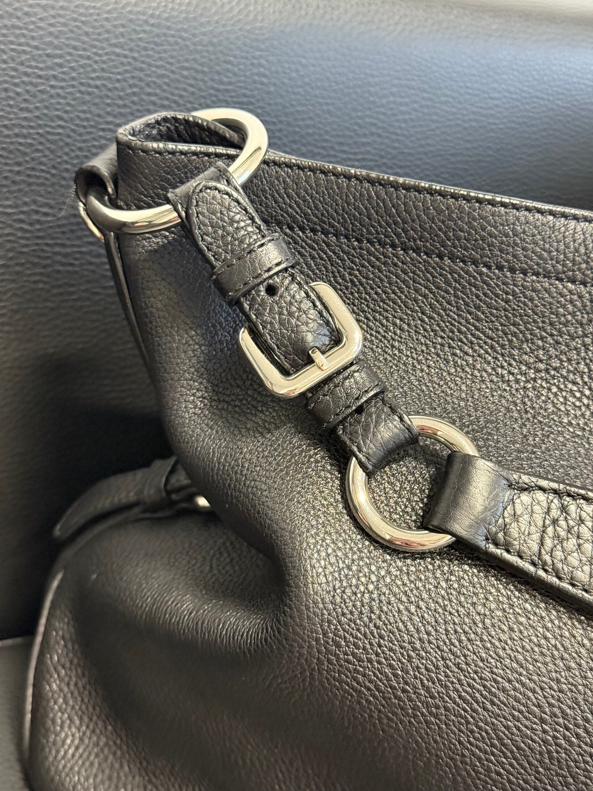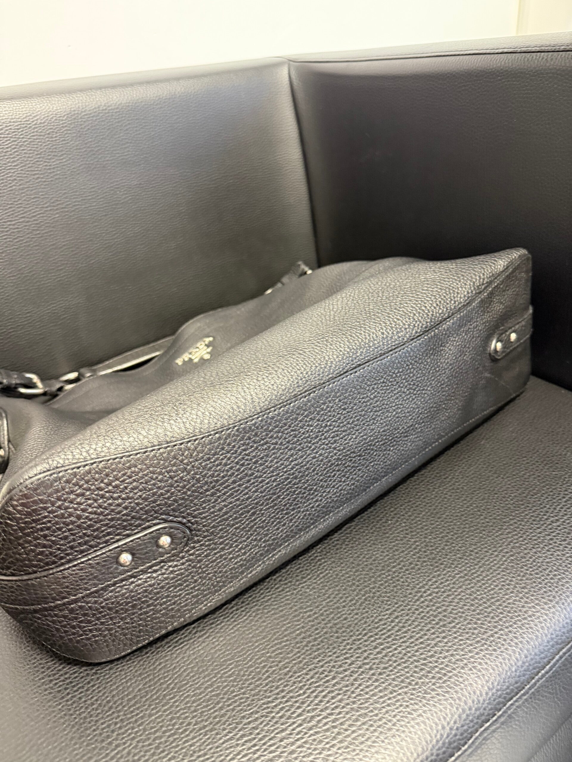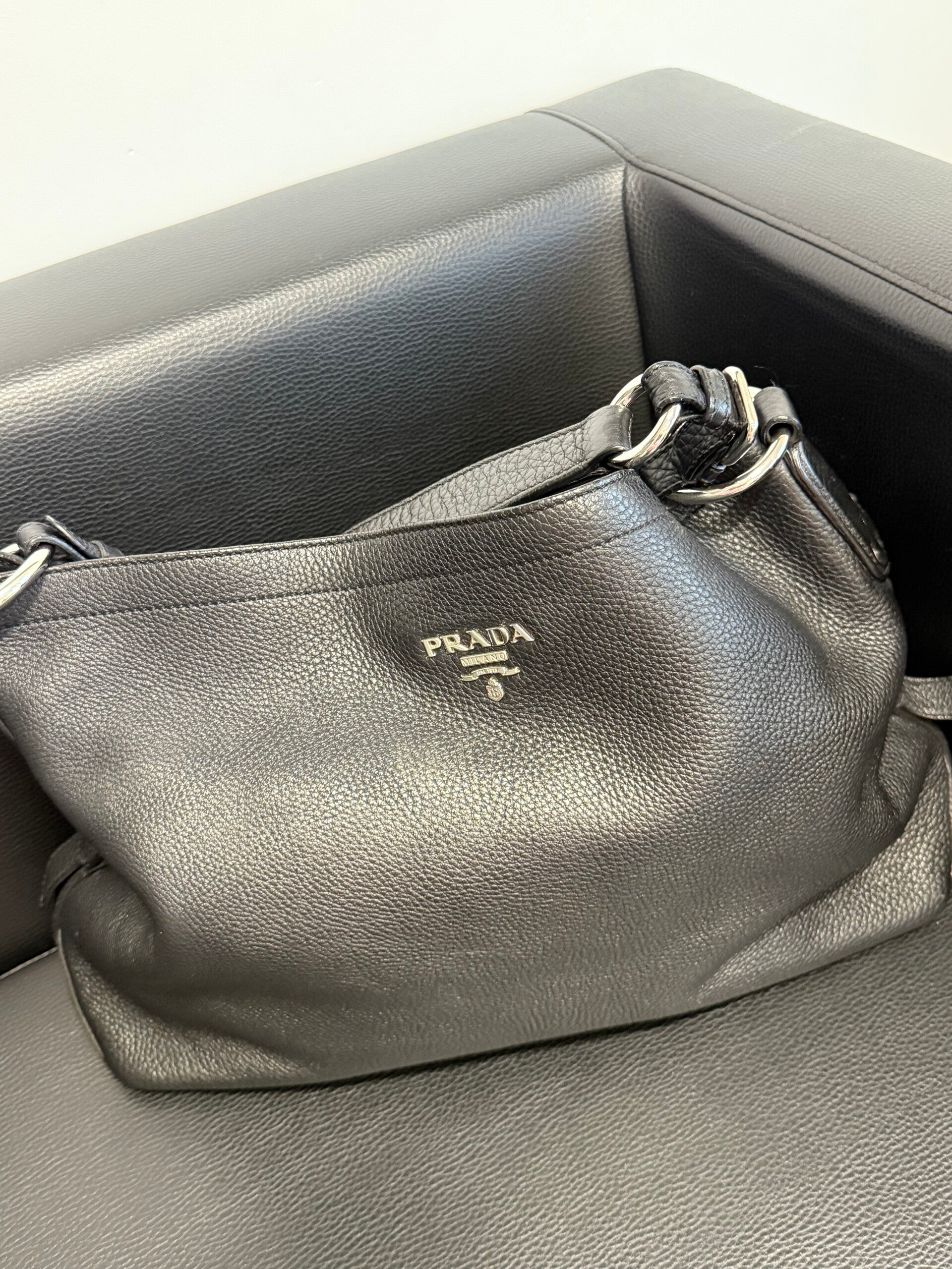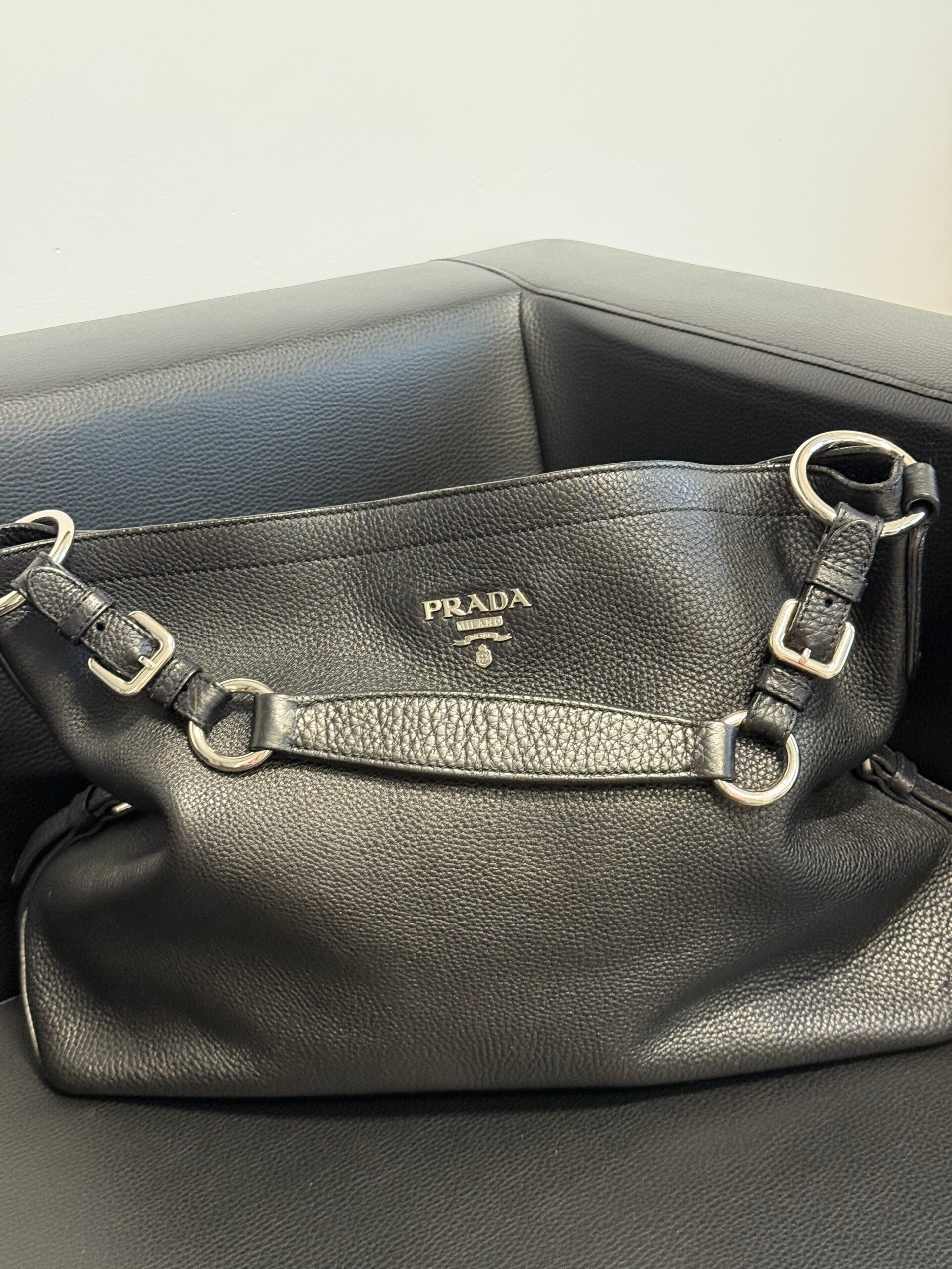 Elegante e funzionale, questa shoulder bag firmata Prada unisce linee morbide e design pulito a dettagli tecnici iconici. Realizzata in pelle martellata nera, è resistente, capiente e perfetta per l’uso quotidiano.
