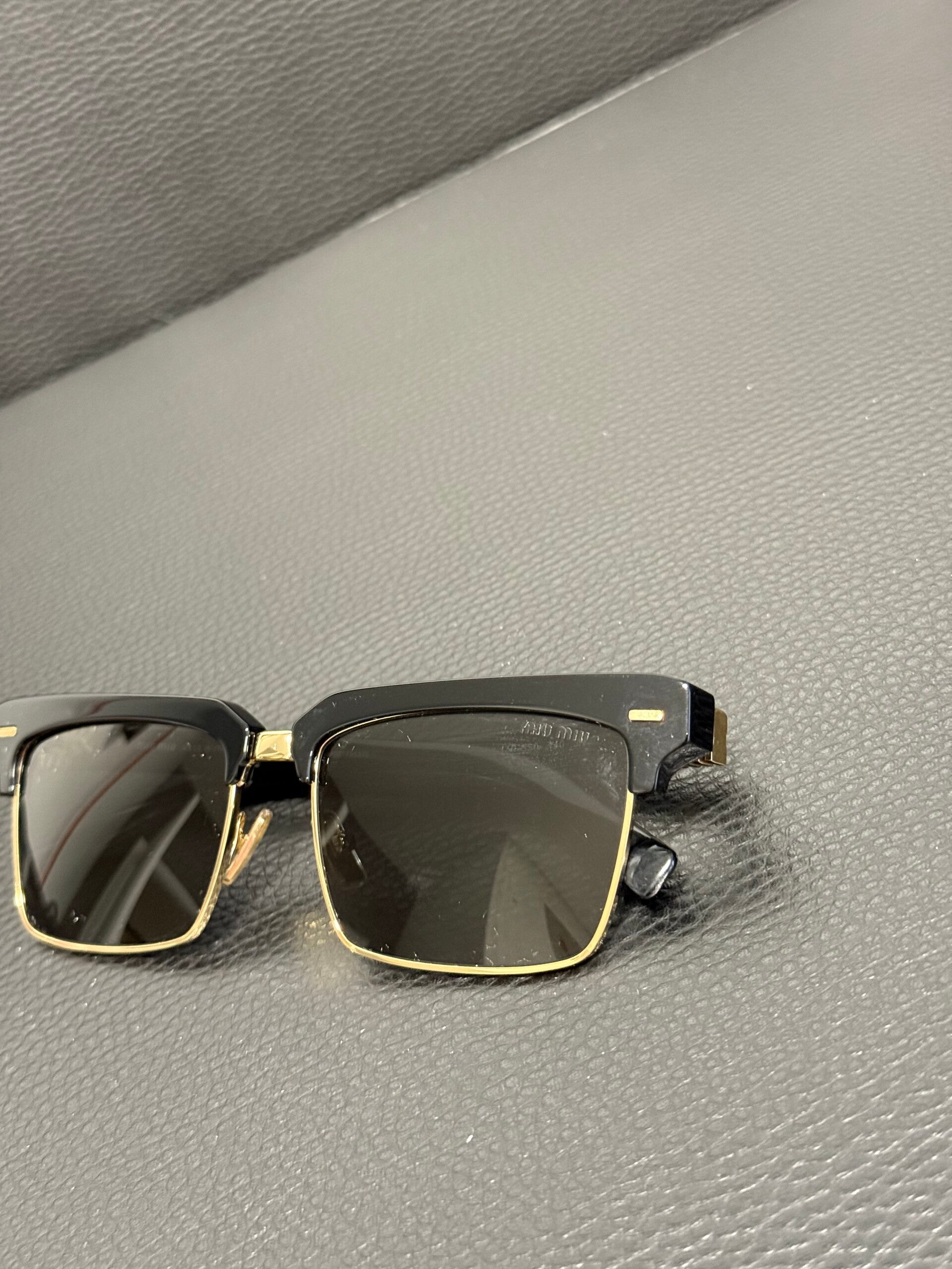 Occhiali da sole firmati Miu Miu dallo stile fashion e contemporaneo, con linea geometrica decisa e profilo metallico dorato a contrasto.