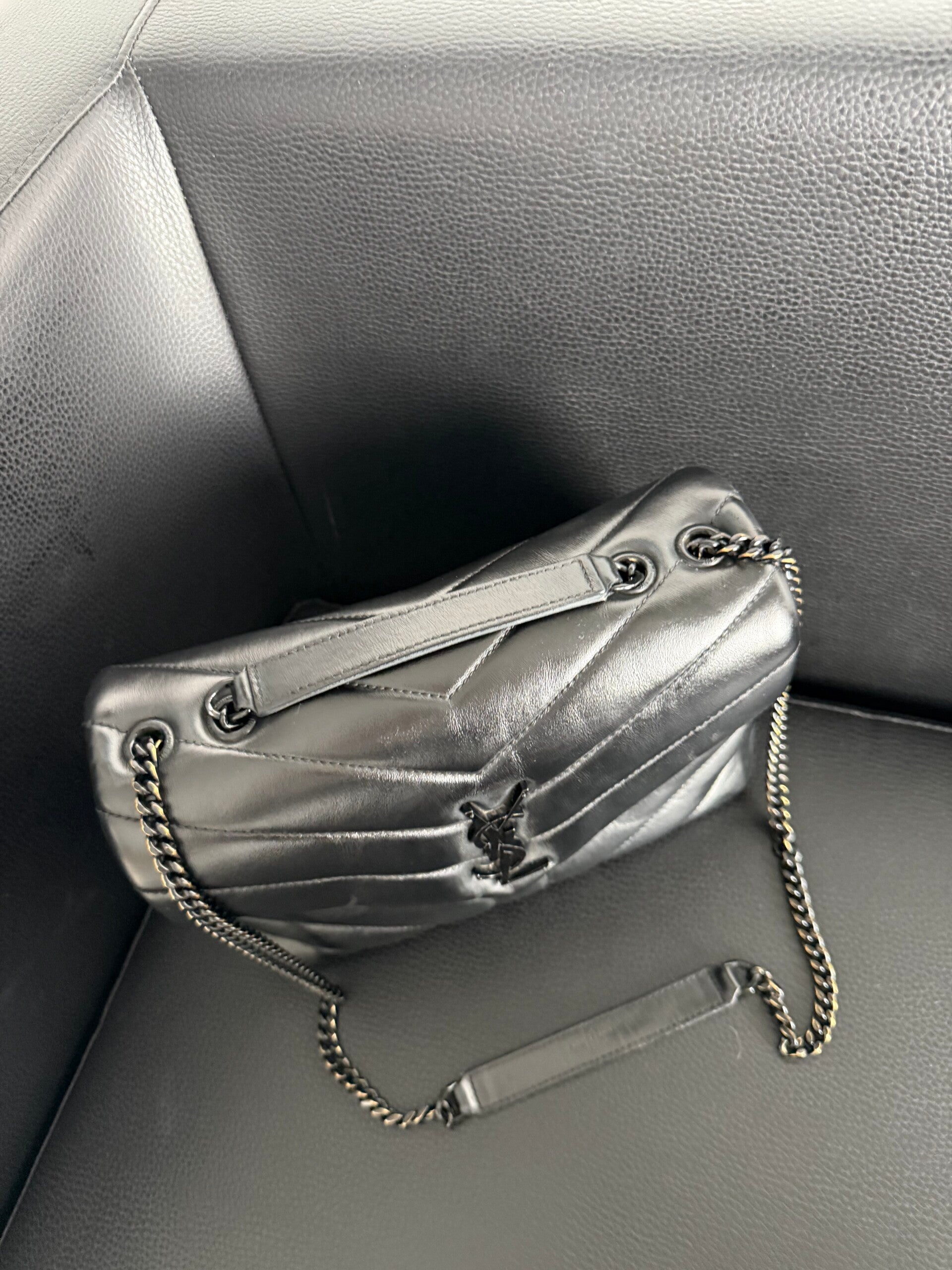 Iconica borsa Saint Laurent modello Loulou, realizzata in morbida pelle matelassé con motivo chevron e impreziosita dall’inconfondibile logo YSL frontale in metalleria tono su tono.