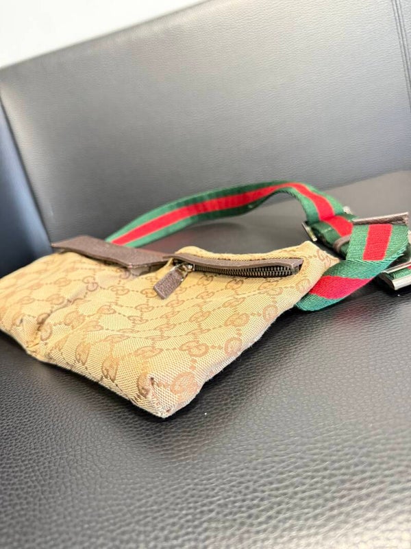 Realizzata in tela GG monogram beige, presenta due tasche frontali con patta e dettagli in pelle marrone. La cintura regolabile con l’inconfondibile nastro Web verde e rosso richiama uno degli elementi più storici del brand, mentre la chiusura con fibbia metallica incisa Gucci completa il design con un tocco vintage.Compatta ma pratica, è perfetta da indossare in vita o crossbody per un look contemporaneo e dinamico.