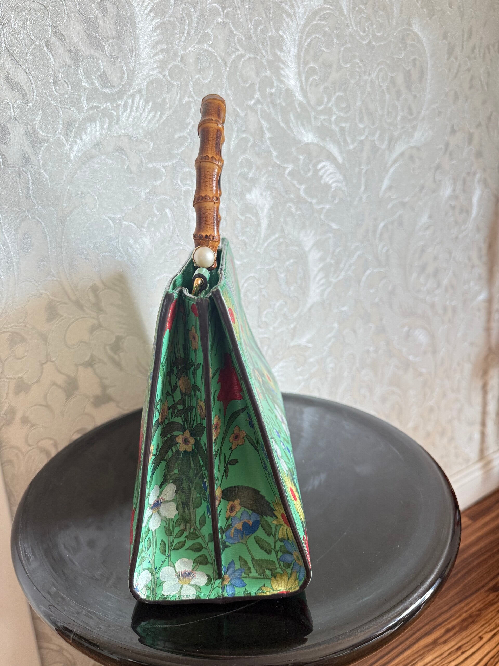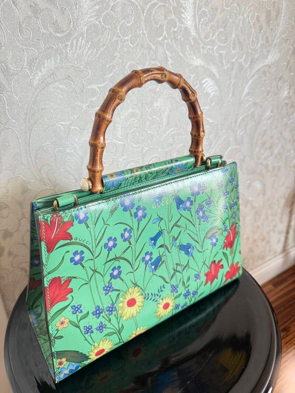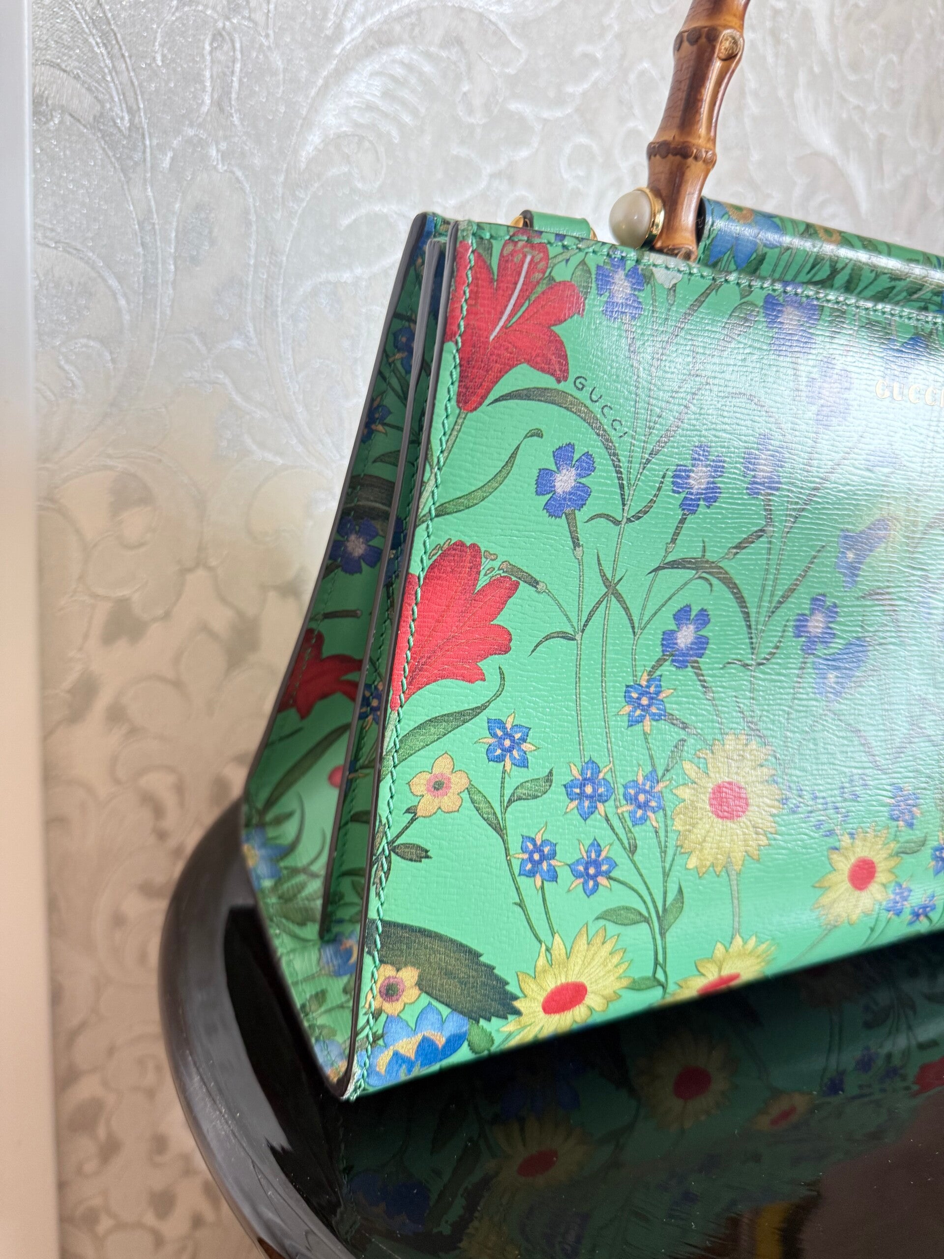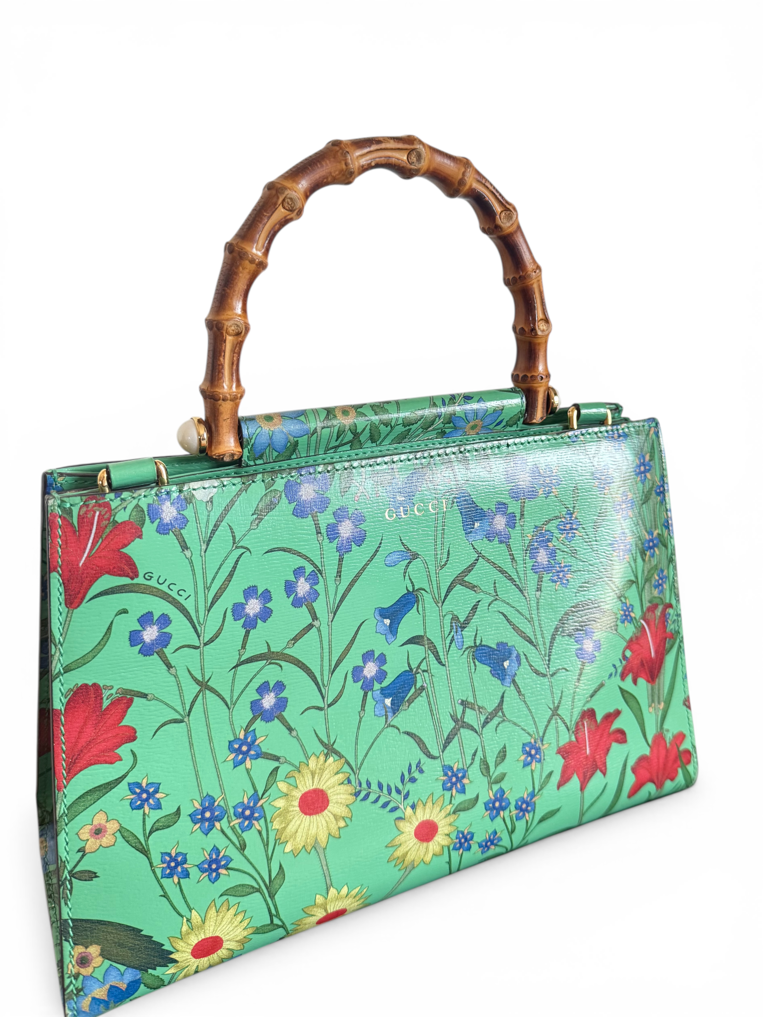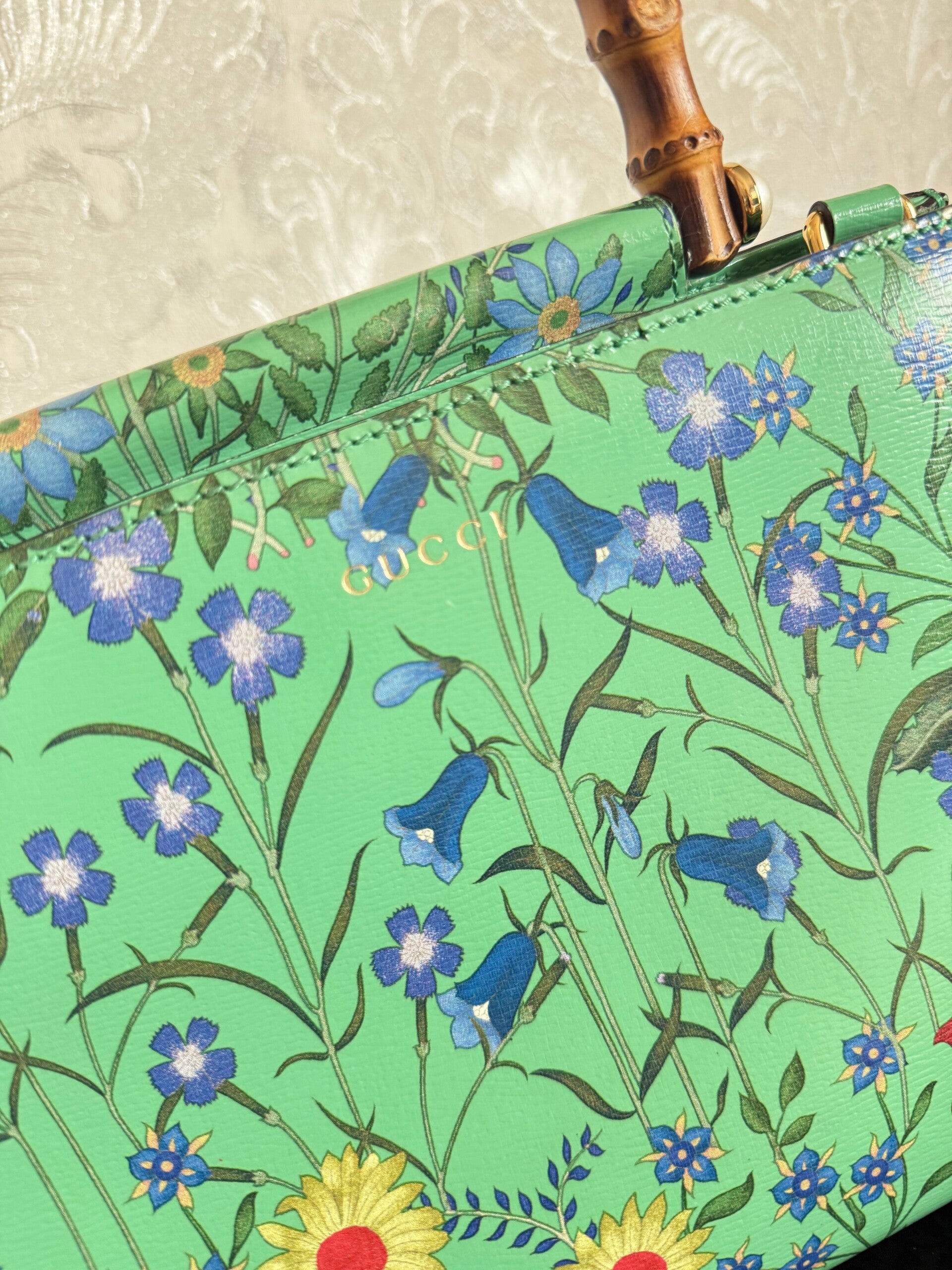 La base verde luminosa è impreziosita da una delicata stampa floreale multicolor che richiama un raffinato giardino primaverile. La struttura rigida dona alla borsa un’eleganza sofisticata, mentre il manico in bambù scolpito aggiunge un tocco unico e immediatamente riconoscibile.