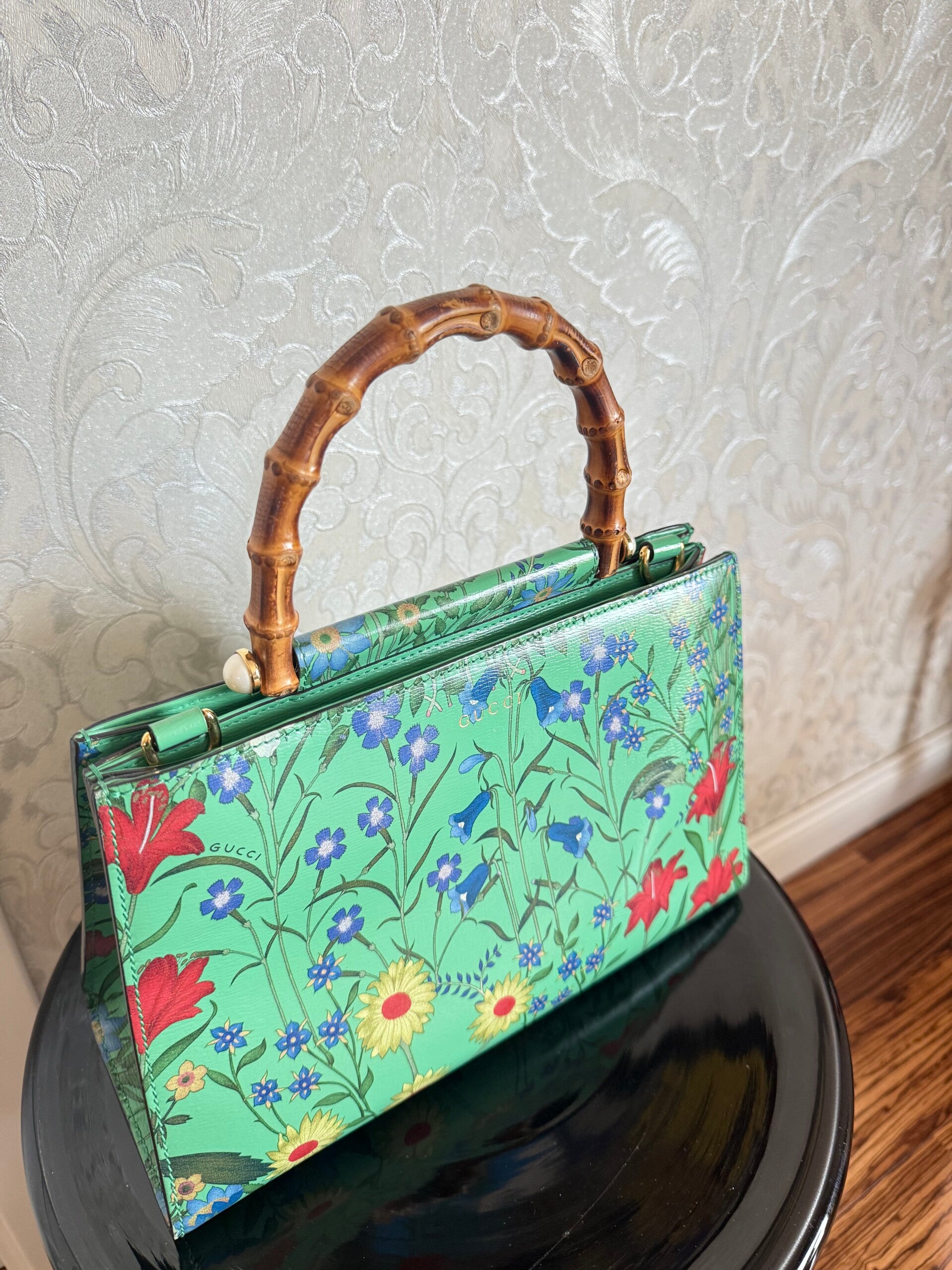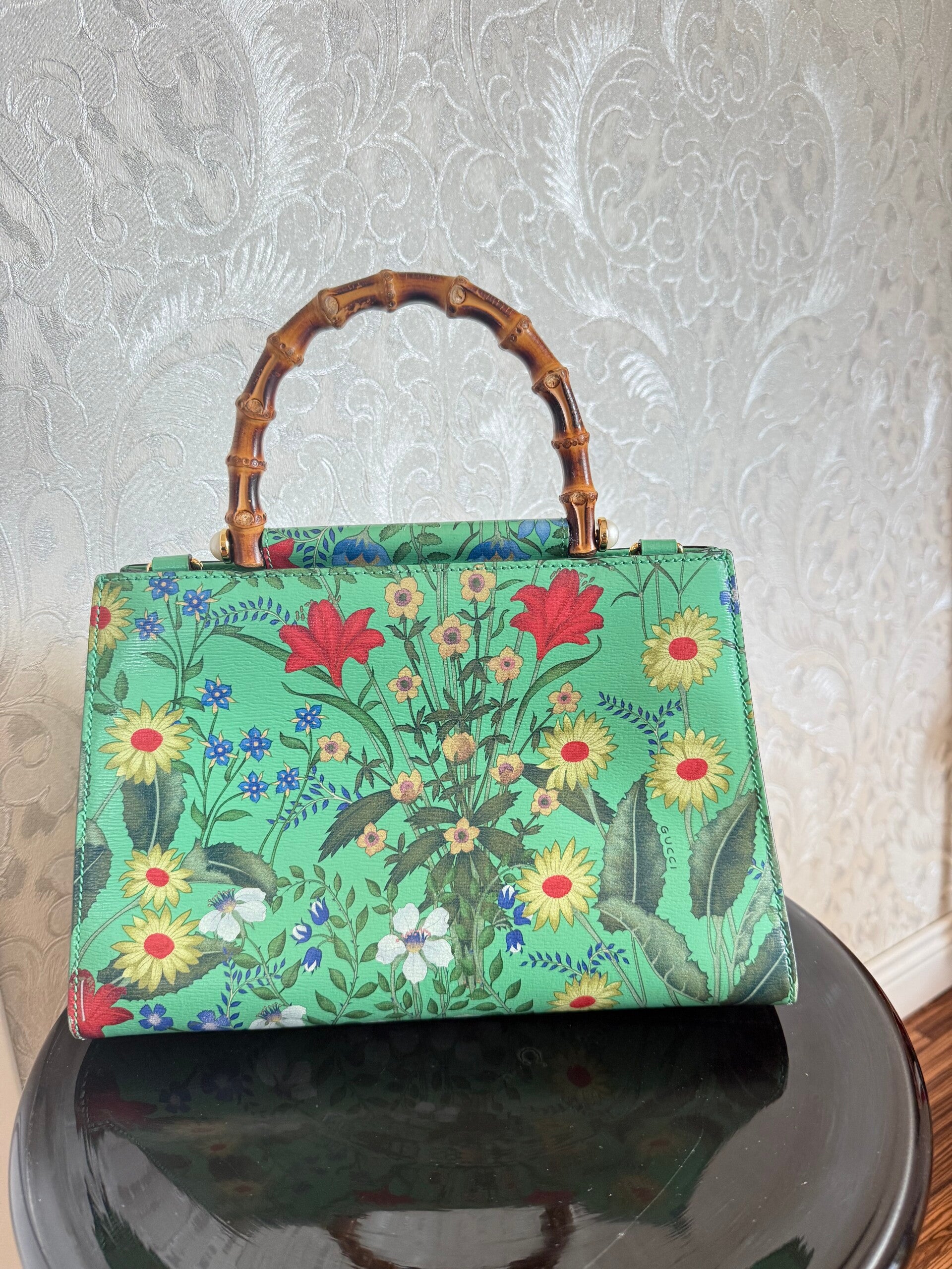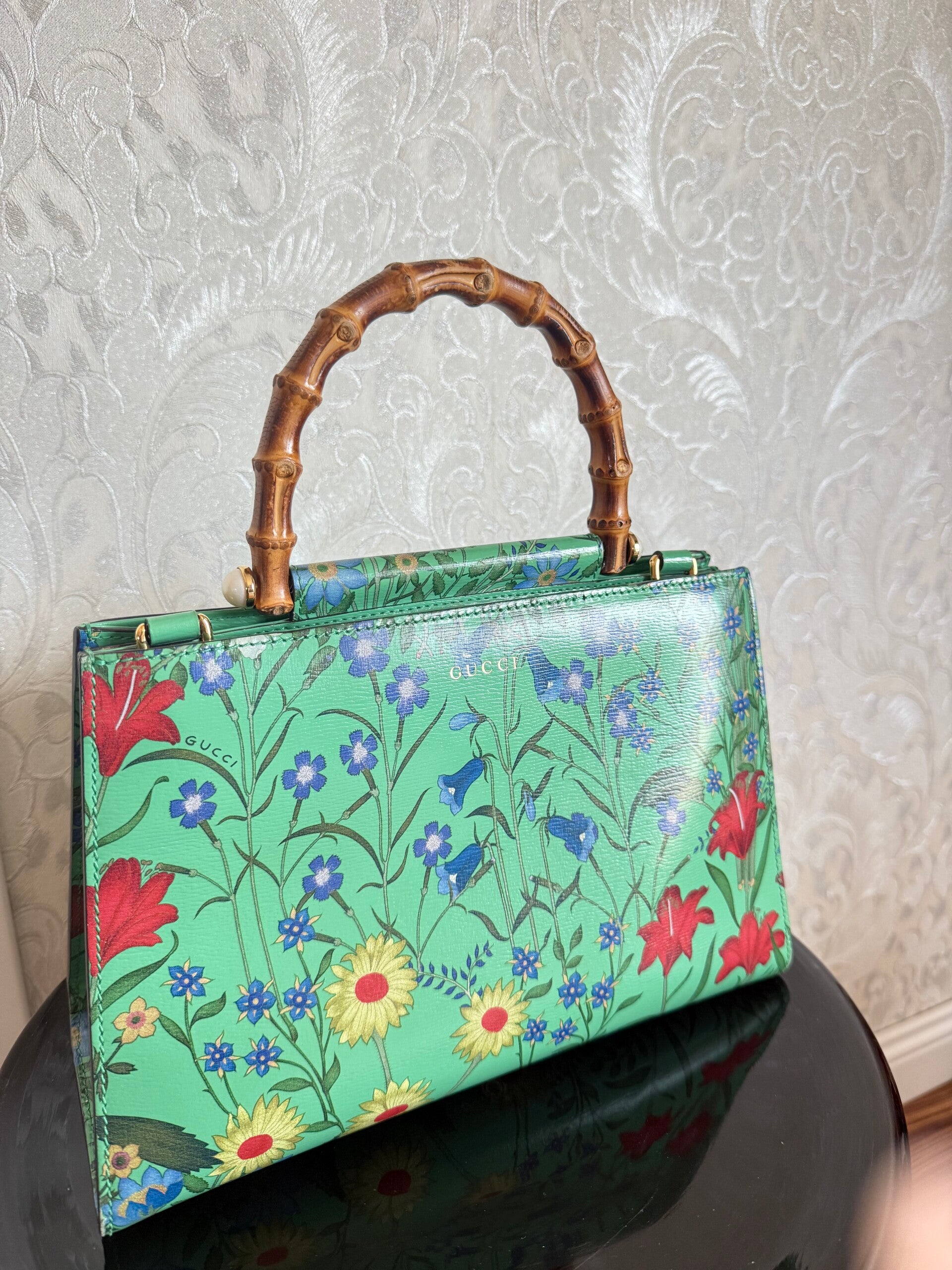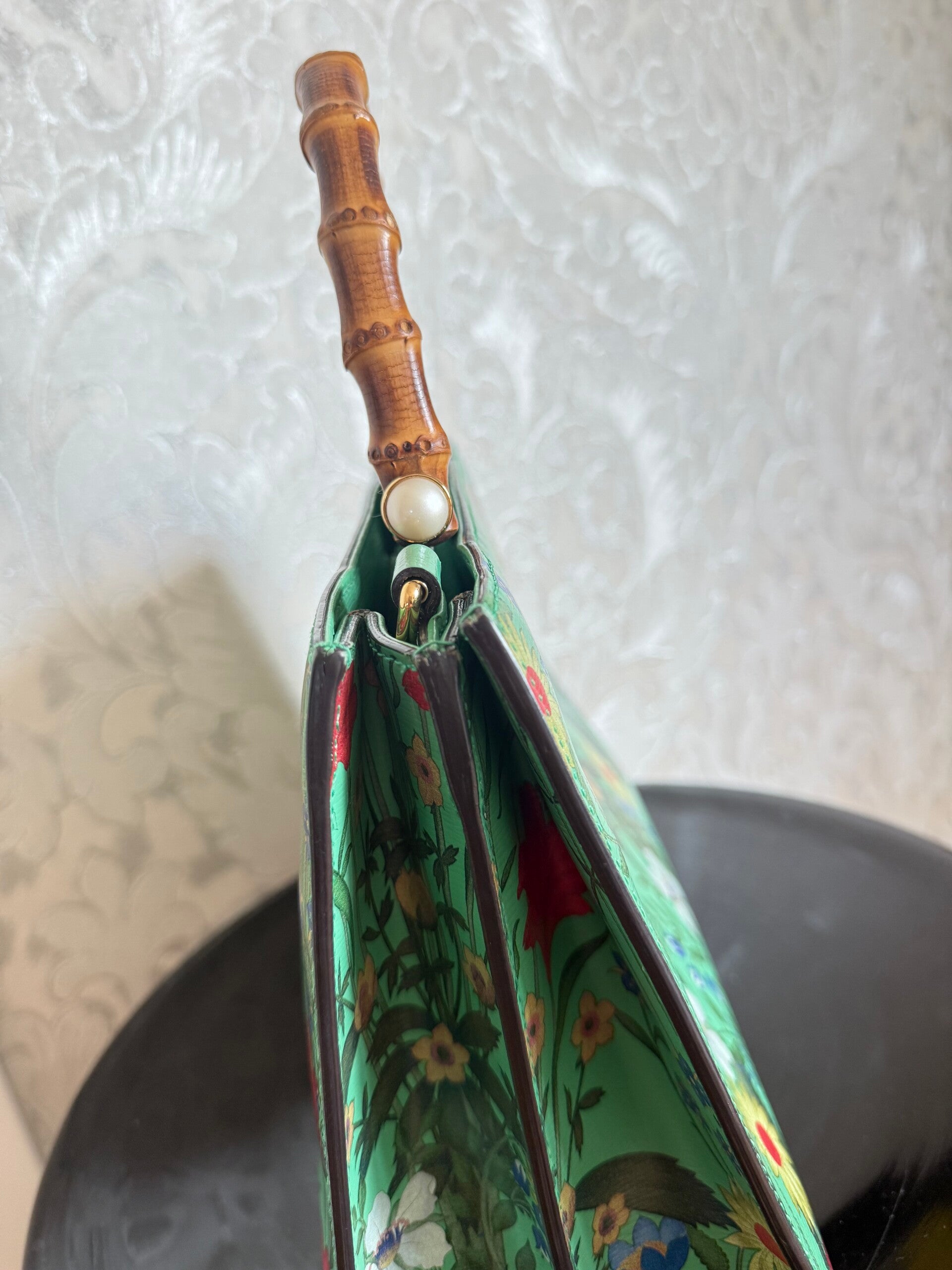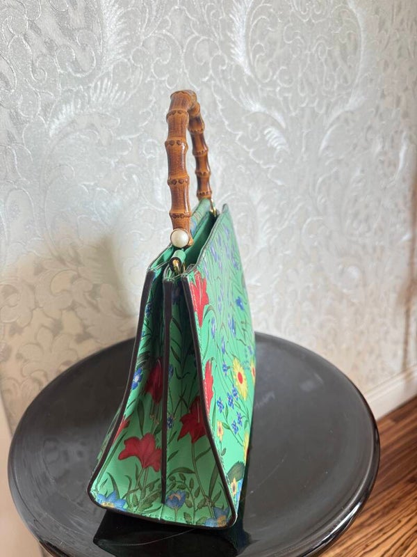 La base verde luminosa è impreziosita da una delicata stampa floreale multicolor che richiama un raffinato giardino primaverile. La struttura rigida dona alla borsa un’eleganza sofisticata, mentre il manico in bambù scolpito aggiunge un tocco unico e immediatamente riconoscibile.
