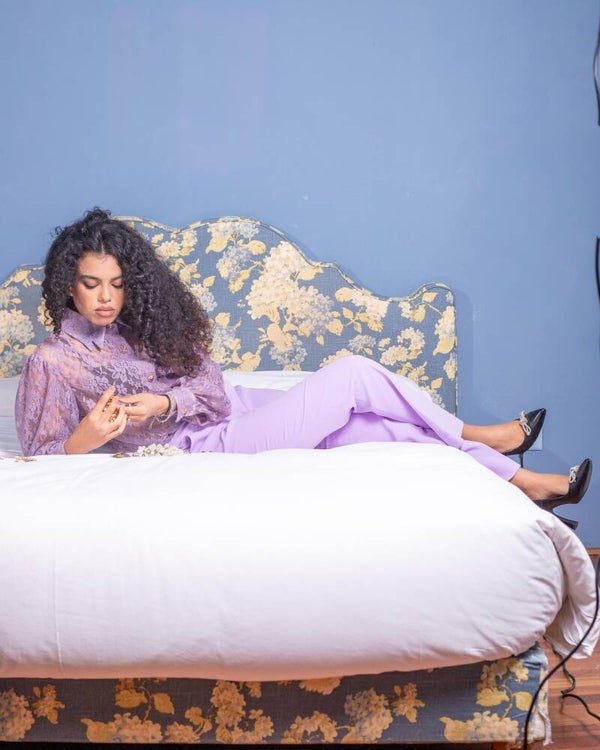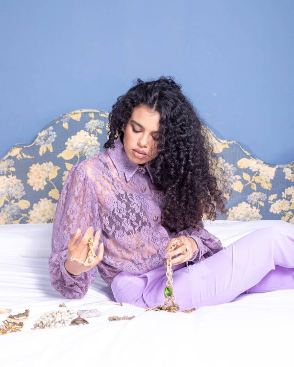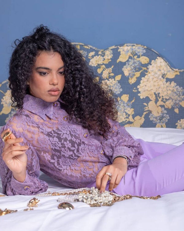 Camicia in pizzo dal design simmetrico, caratterizzata da una raffinata trasparenza che valorizza la silhouette con eleganza. La vestibilità morbida e le maniche leggermente a sbuffo donano movimento e femminilità al capo. Colletto strutturato a due punte, elegante e definito, pensato per valorizzare il décolleté con un tocco distintivo.