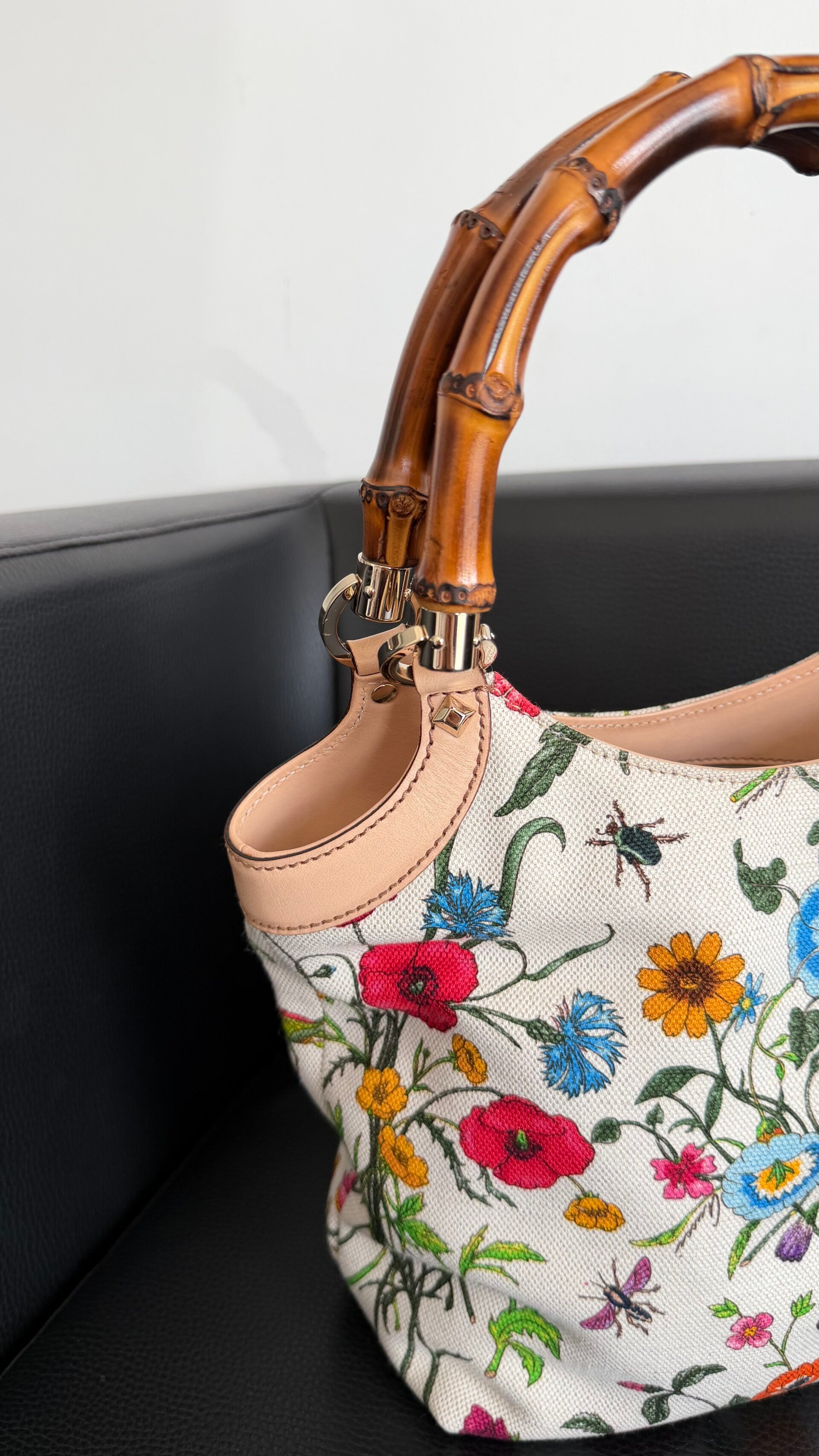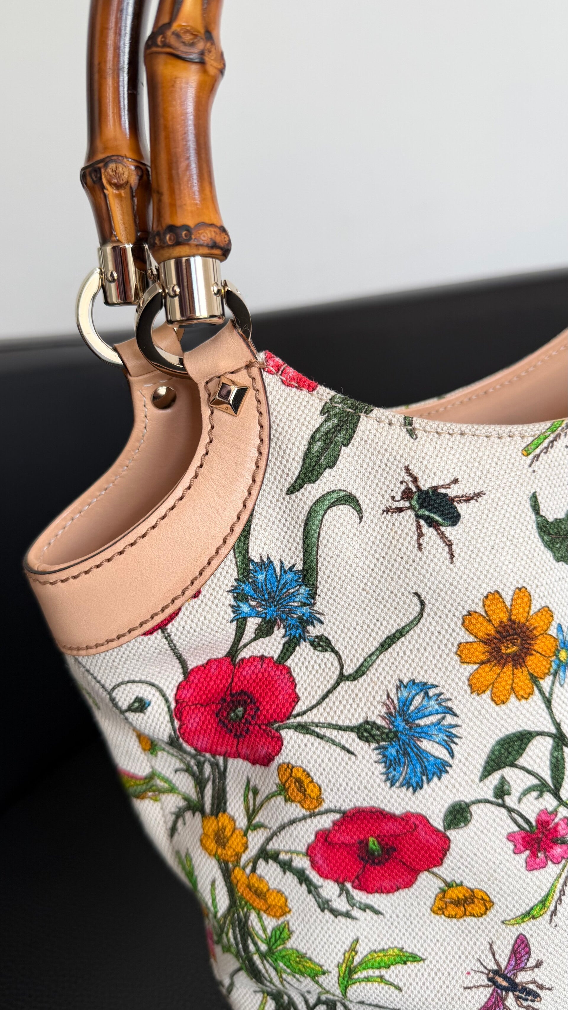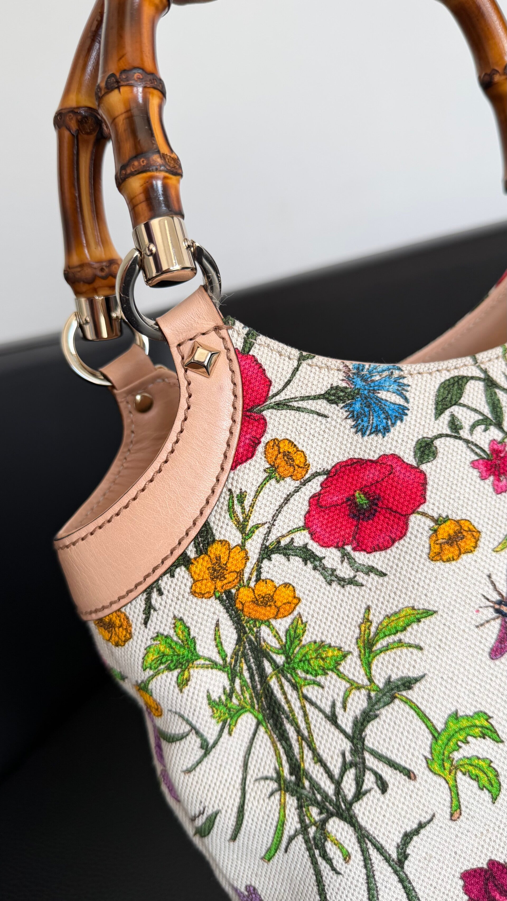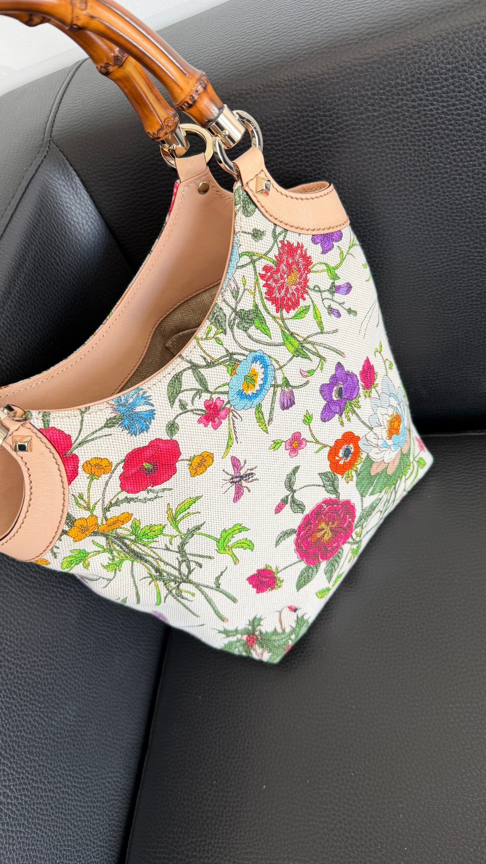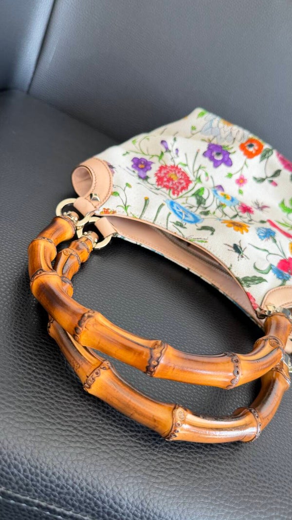 Iconica e senza tempo, questa borsa firmata Gucci unisce eleganza e storia in un design raffinato. Il manico in bambù, simbolo distintivo della maison, incontra la celebre stampa Flora, un intreccio delicato di fiori e dettagli botanici che richiama tutta la freschezza della primavera.