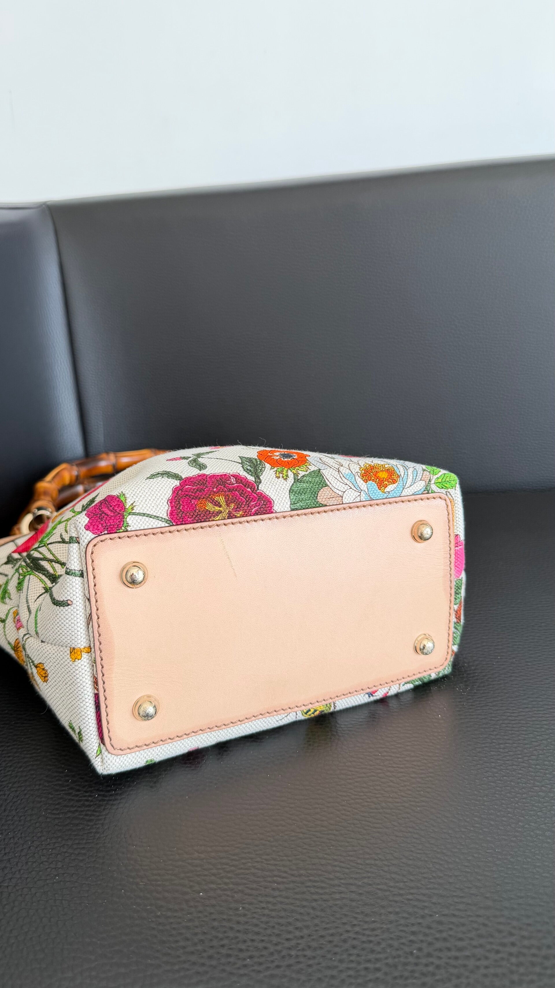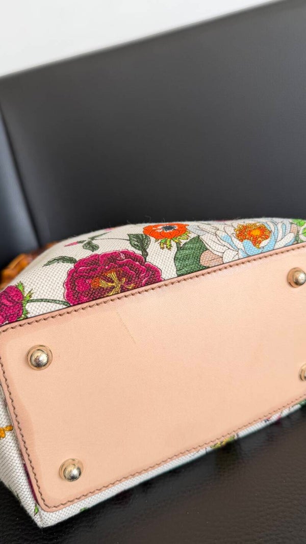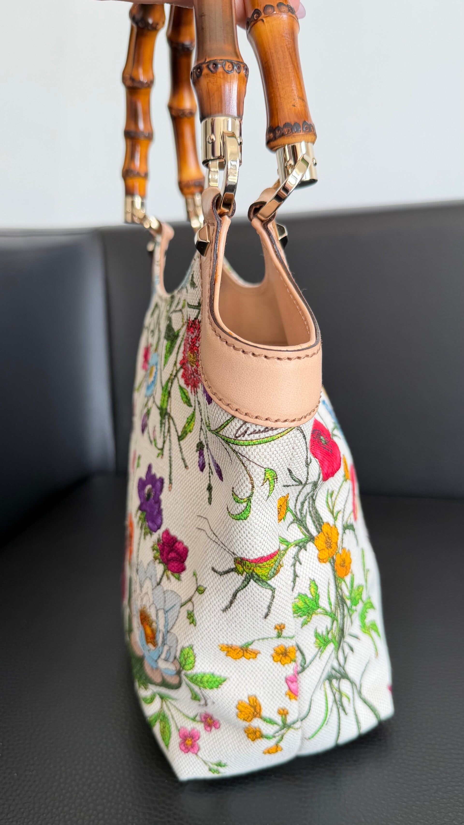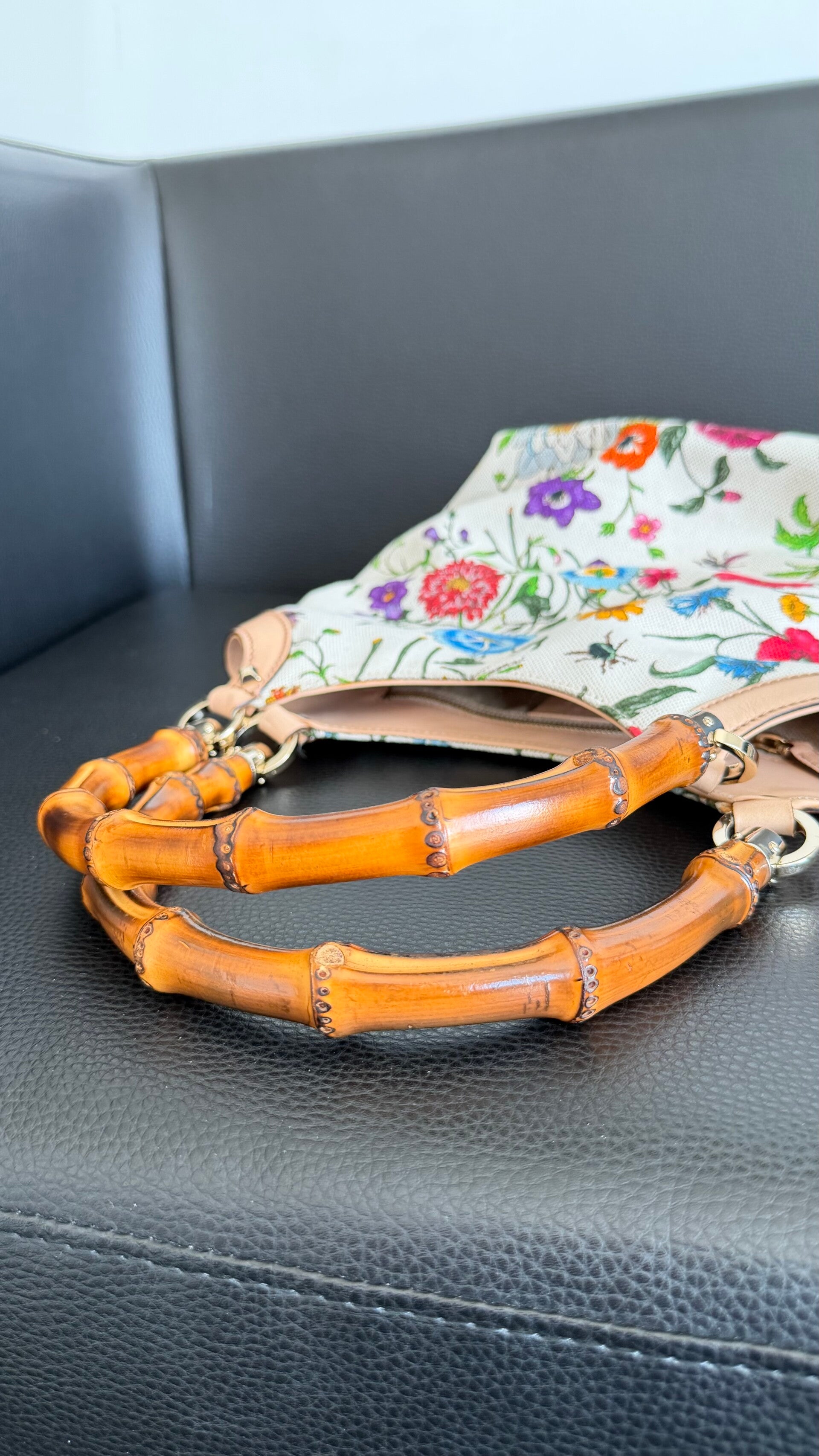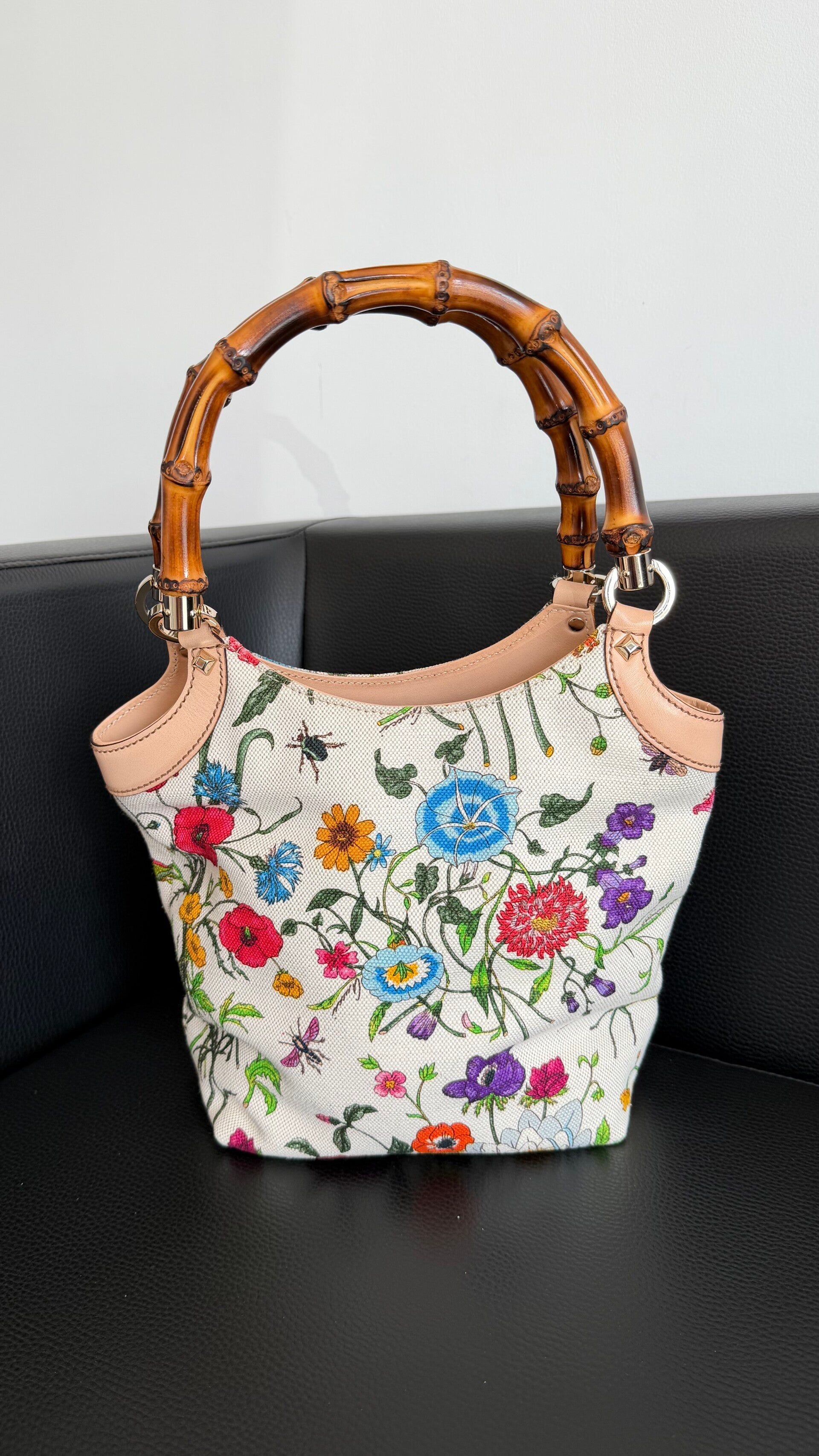 Iconica e senza tempo, questa borsa firmata Gucci unisce eleganza e storia in un design raffinato. Il manico in bambù, simbolo distintivo della maison, incontra la celebre stampa Flora, un intreccio delicato di fiori e dettagli botanici che richiama tutta la freschezza della primavera.