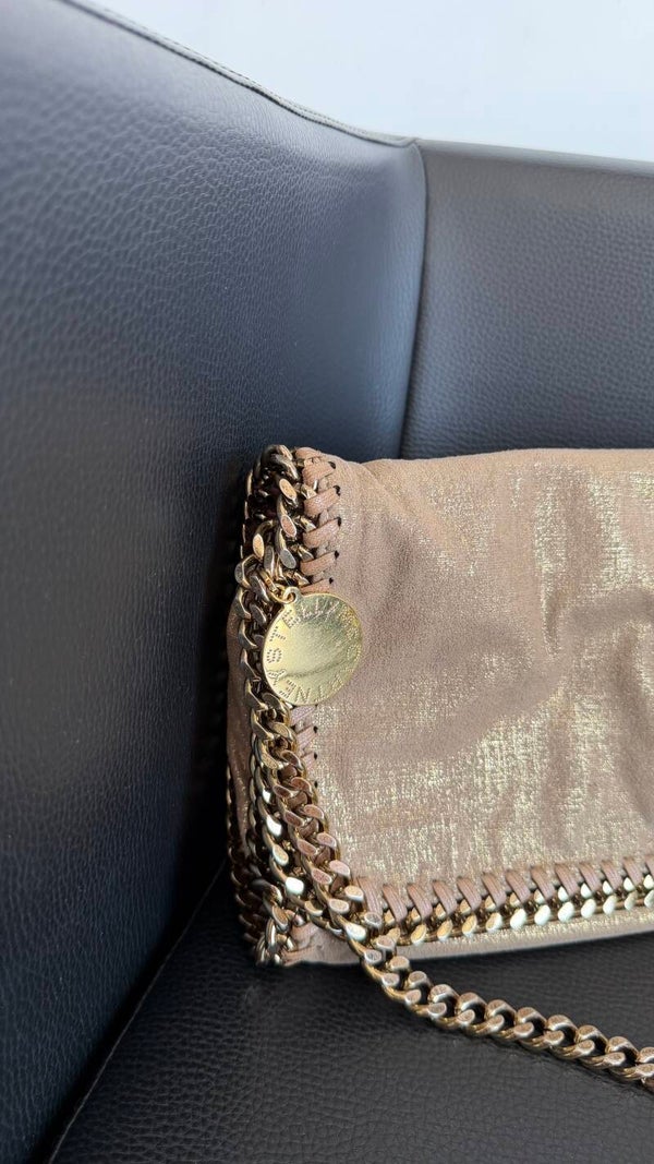 Stella McCartney Falabella Clutch, icona contemporanea dal design riconoscibile e sofisticato. Realizzata nell’inconfondibile materiale soft con finitura lurex luminosa, è impreziosita dal celebre profilo chain trim dorato che incornicia la silhouette morbida. Elegante di sera, chic di giorno: una clutch versatile che aggiunge carattere a qualsiasi look.