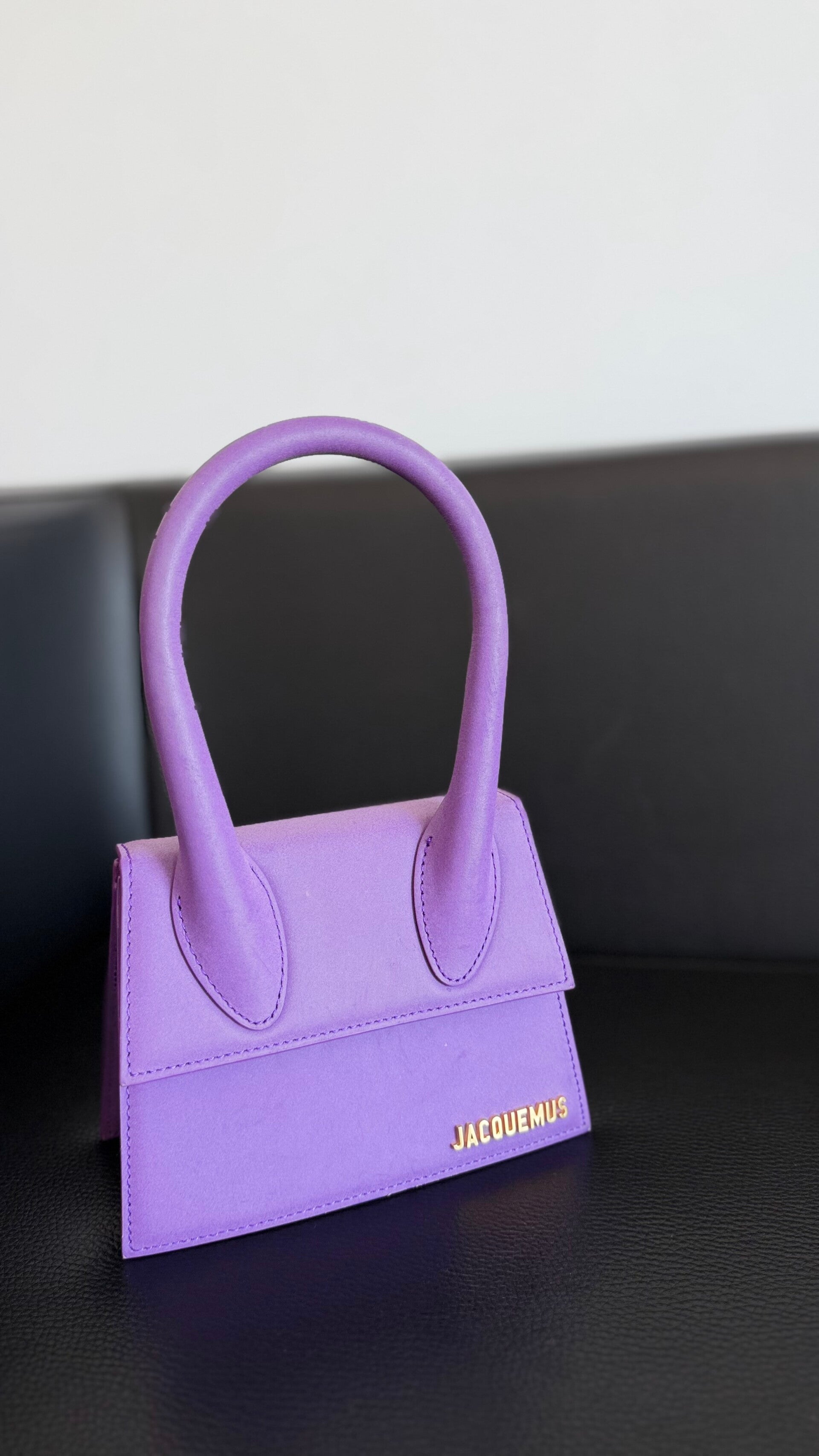 Iconica mini bag firmata Jacquemus dal design scultoreo e contemporaneo, proposta in una raffinata tonalità lavender. Un accessorio statement, perfetto per completare look minimal o dare carattere a outfit più essenziali.